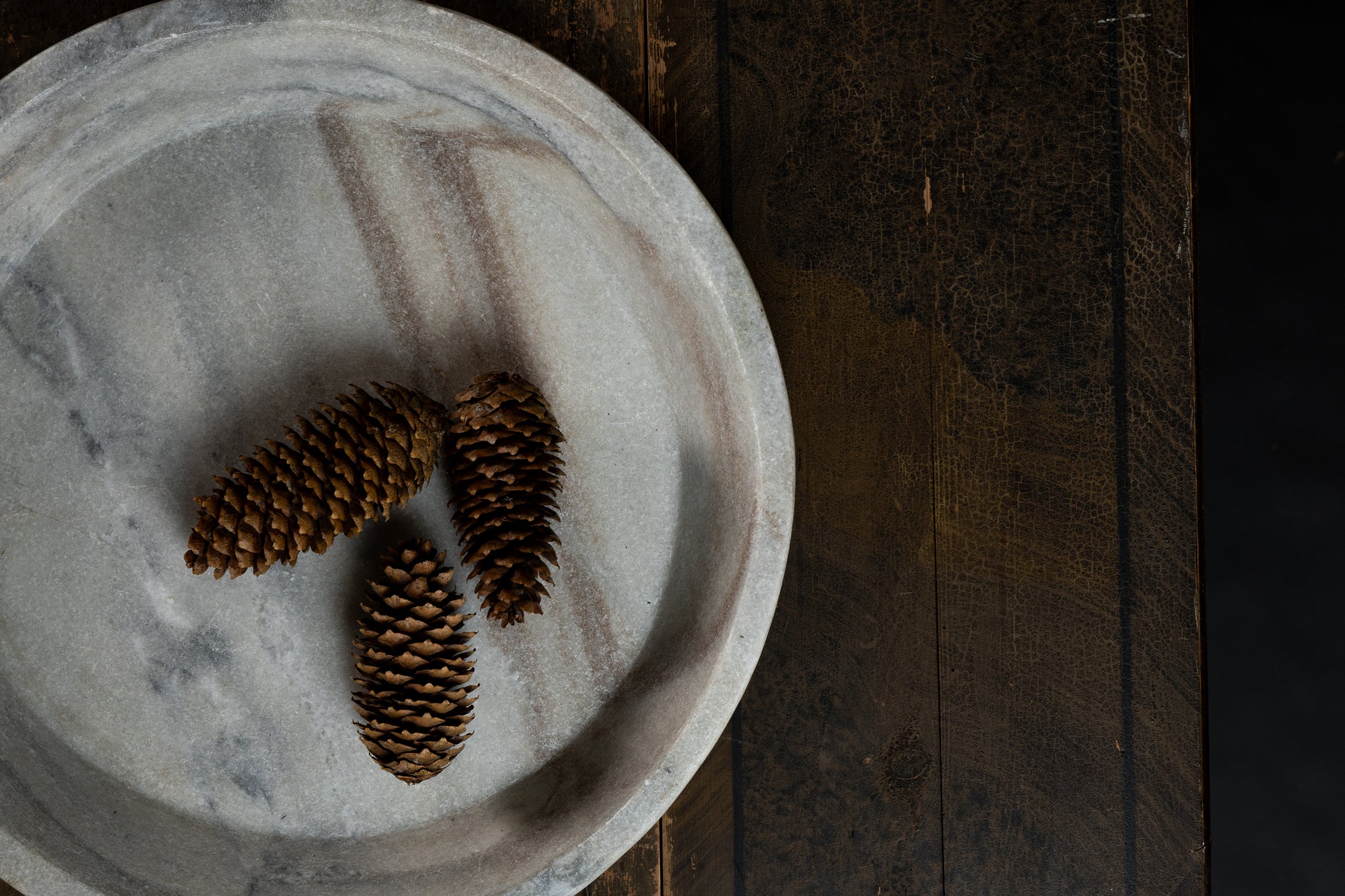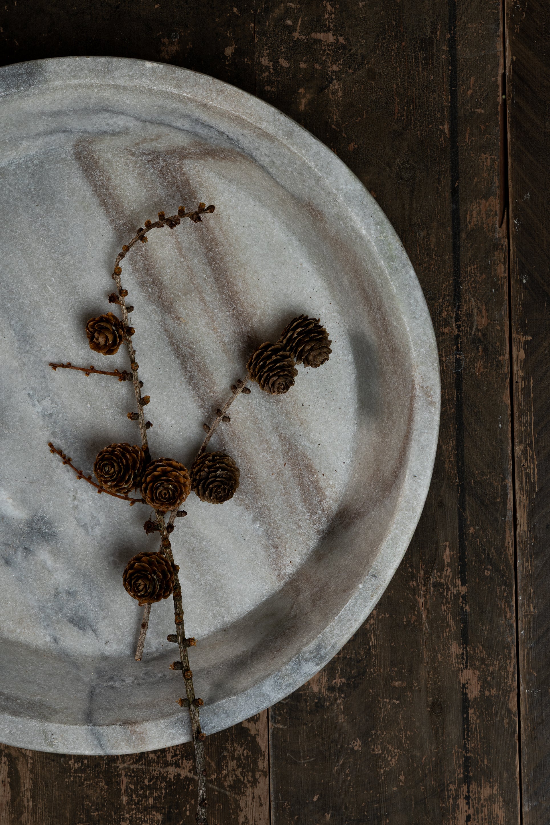 Nydelig stort marmorfat. Dette fatet er elegant og tidløst, og passer i de fleste rom. På kjøkkenet kan det brukes som serveringsfat, til parfymer ol på badet, eller som dekor på stuebordet. Fatat passer godt som lysfat, da marmor tåler varme godt!