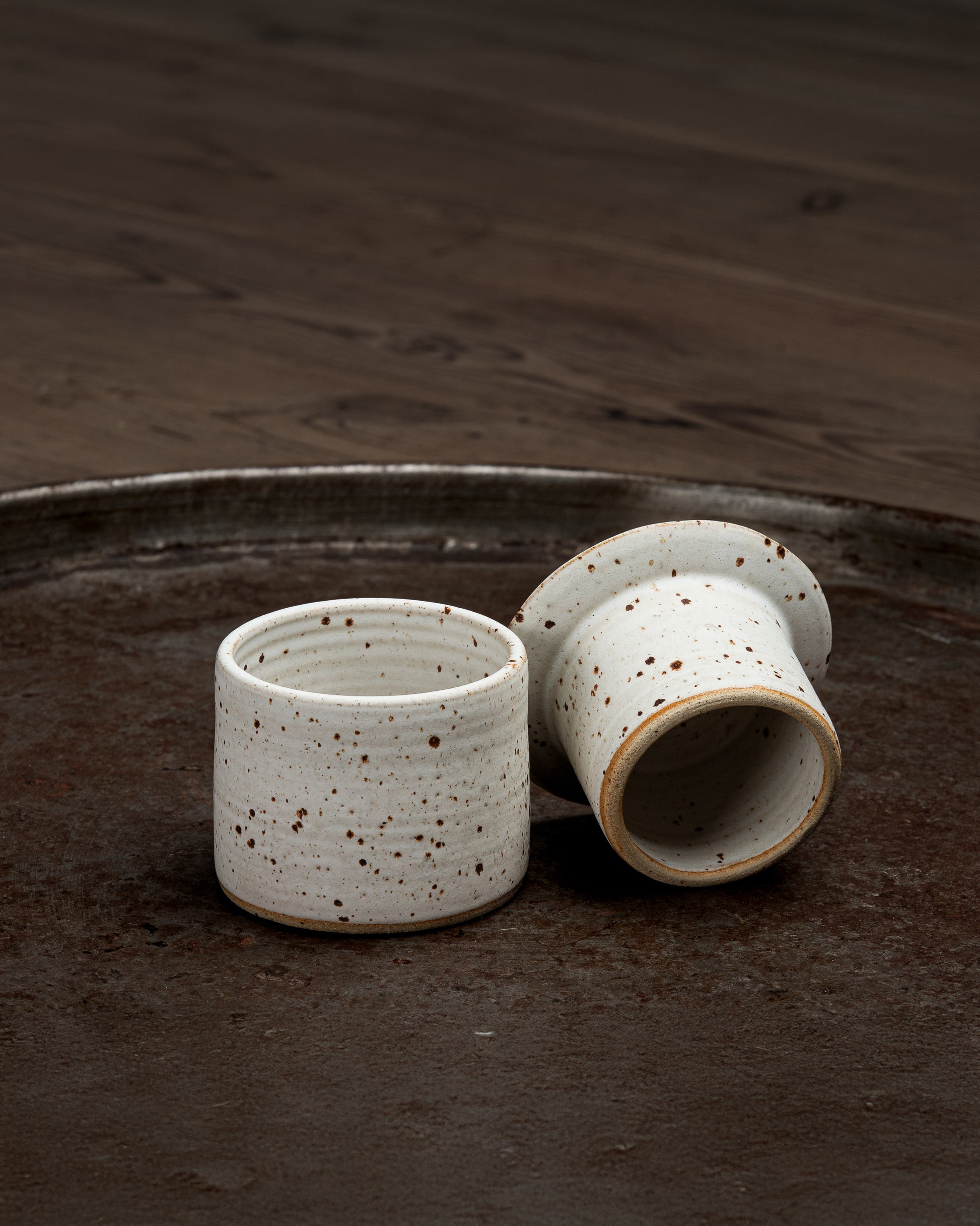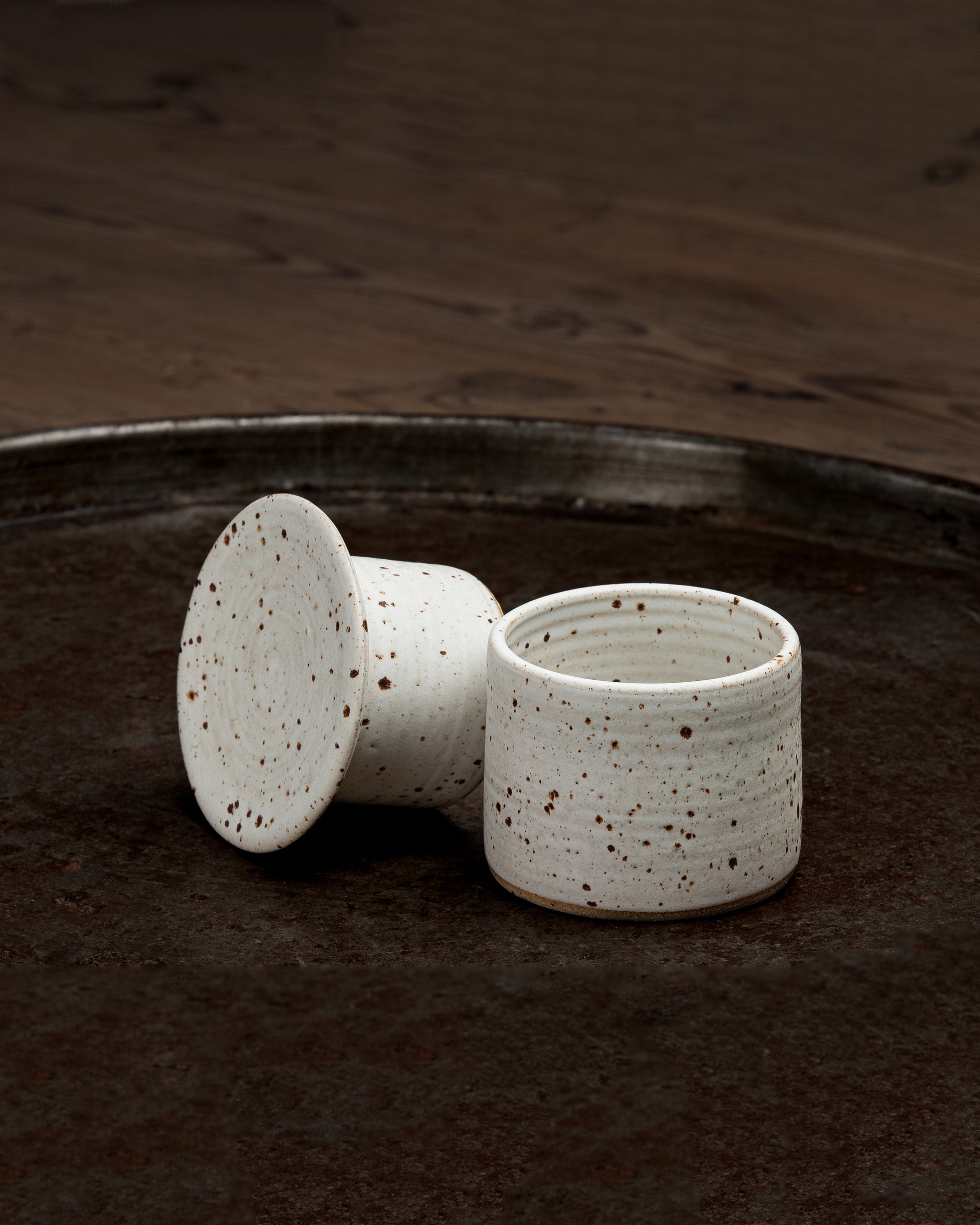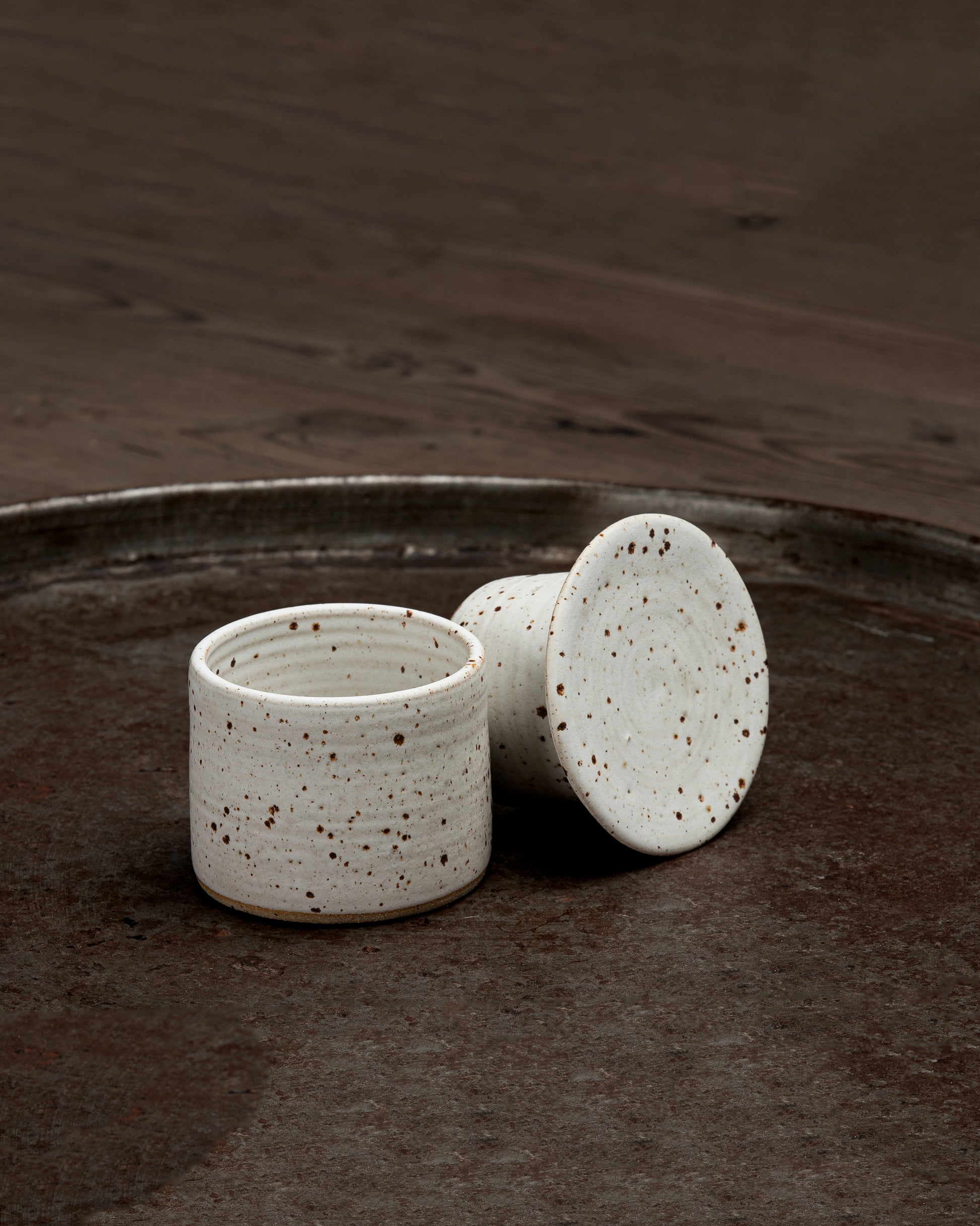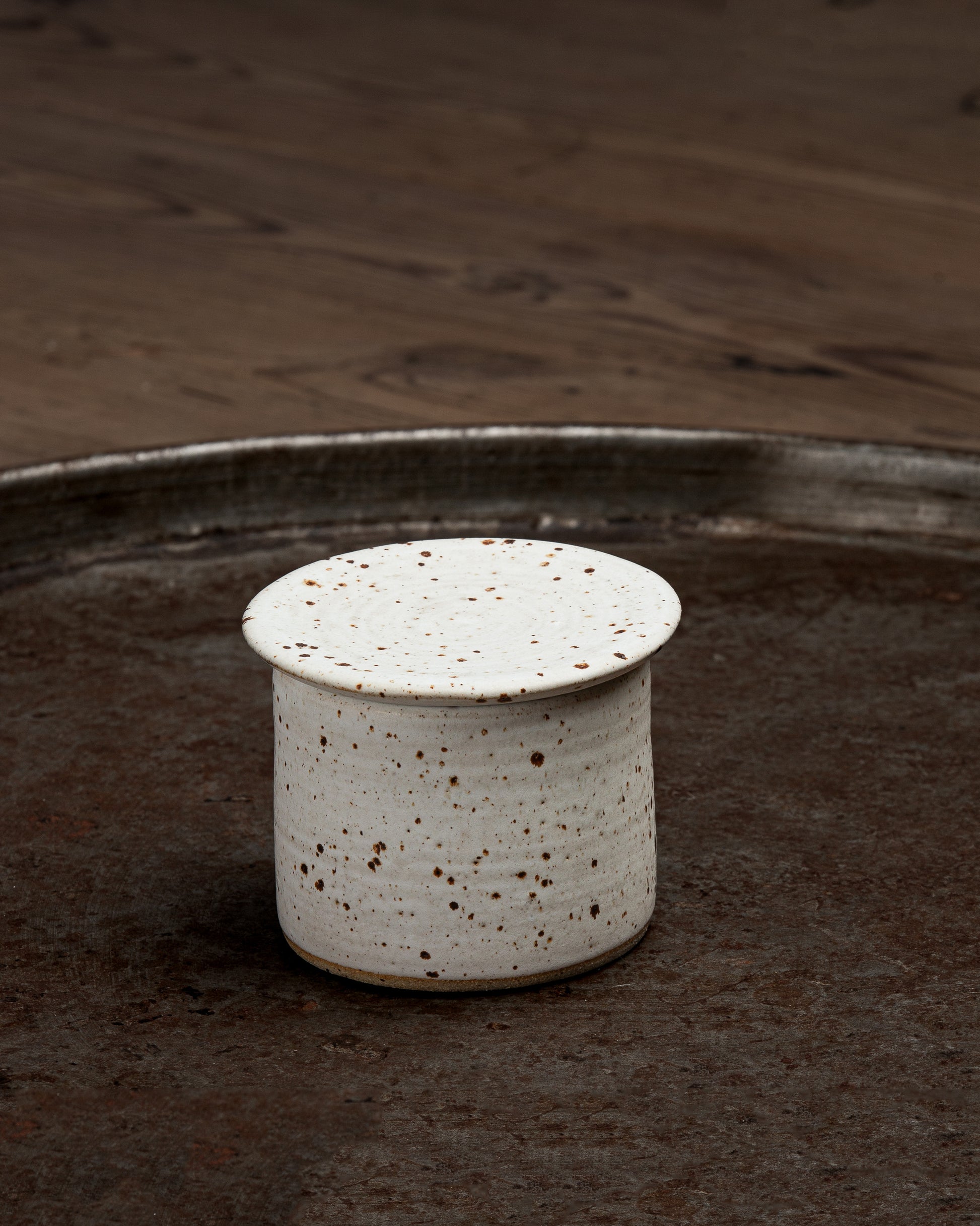 Hånddreid smørklokke i steingodsleire glasert med matt hvit glasur.