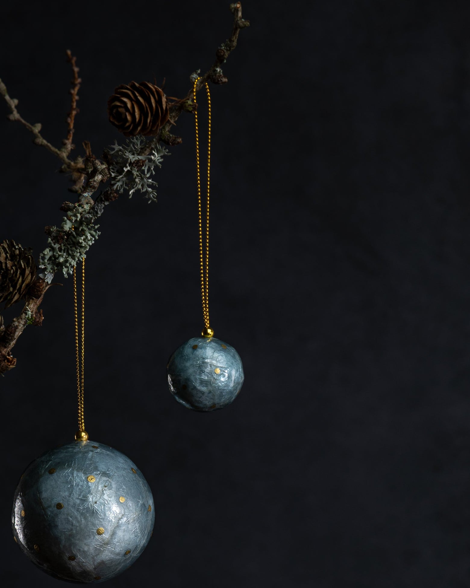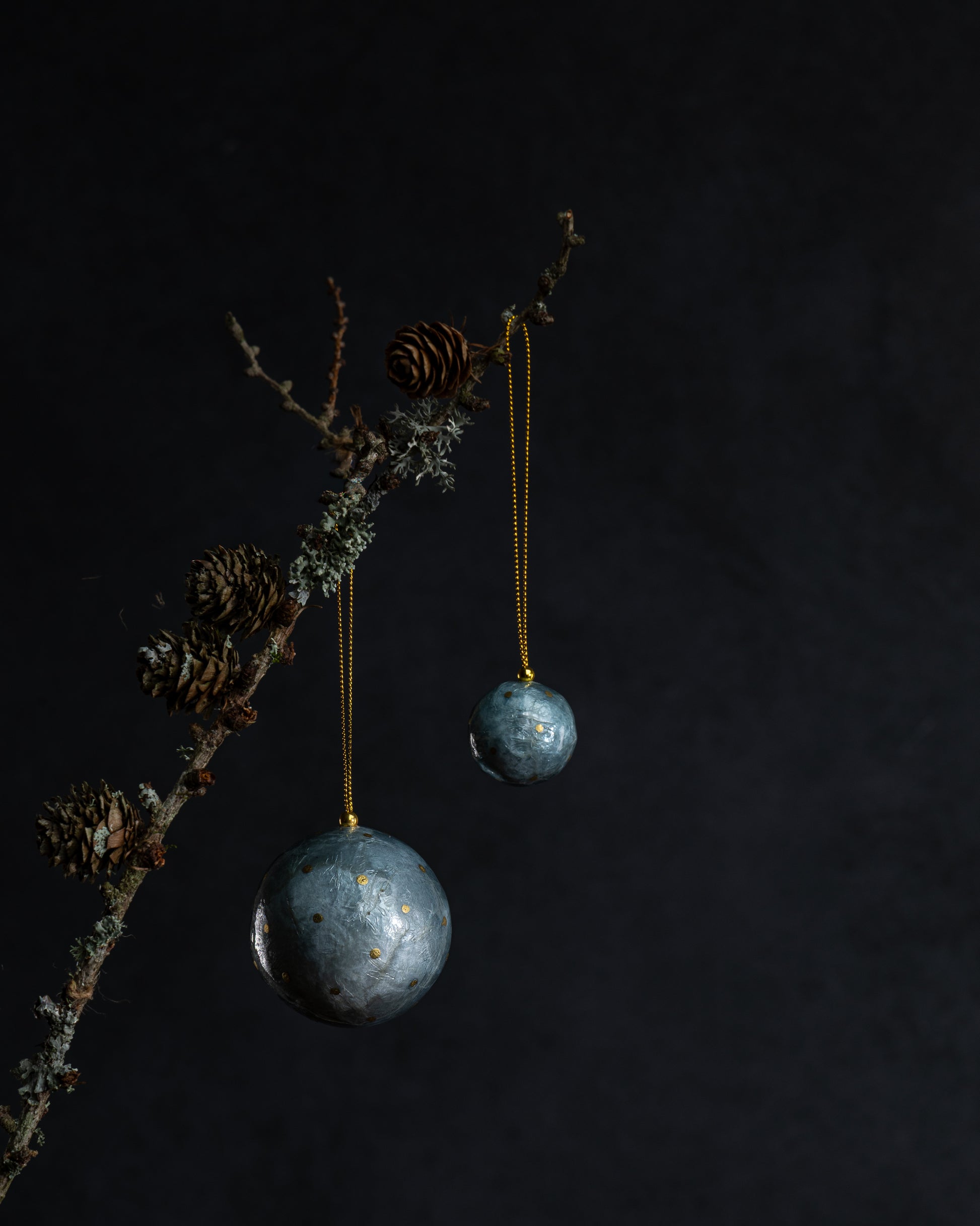 Flott julekule i fargen blå med prikker i gull- Kulen er 6 cm