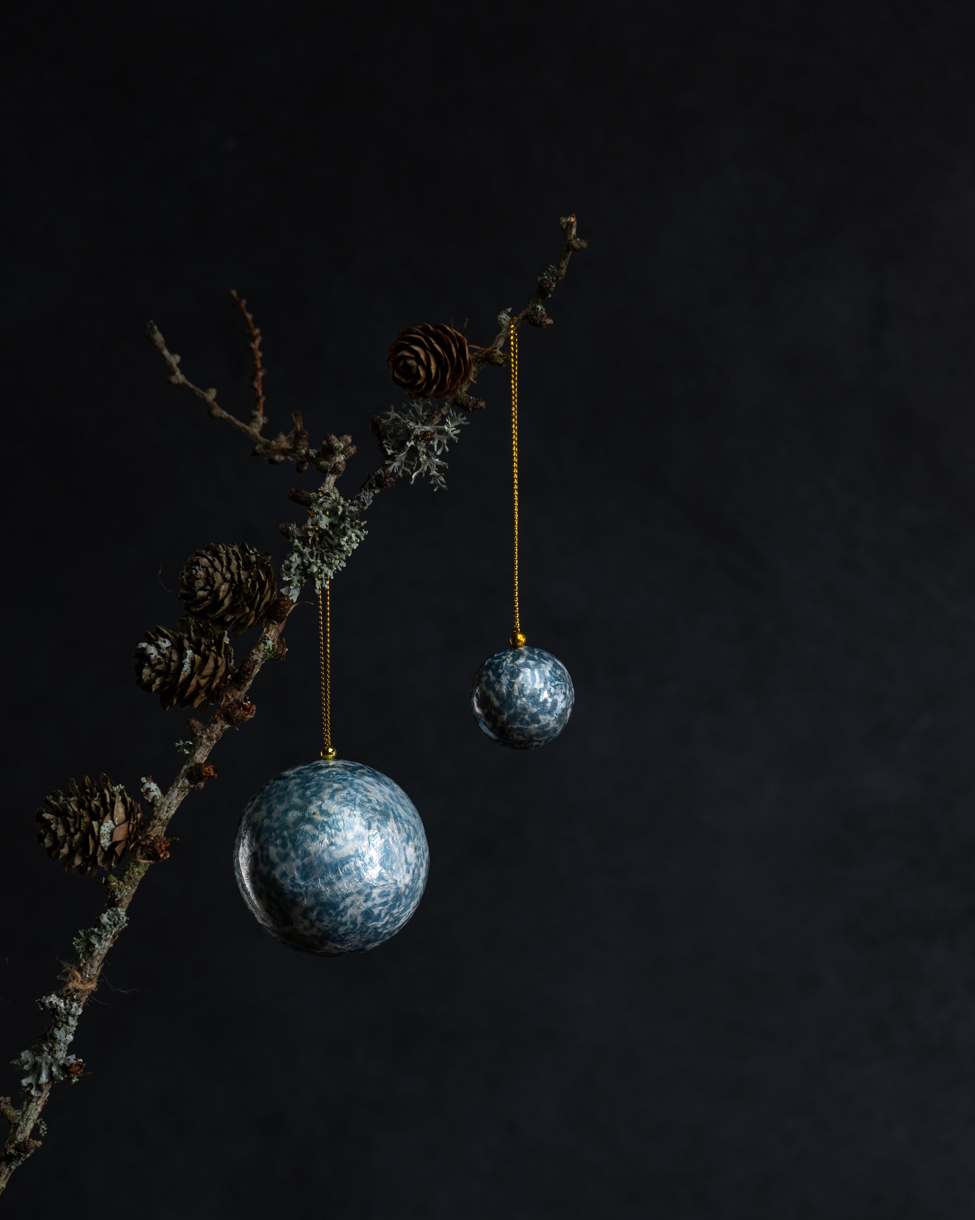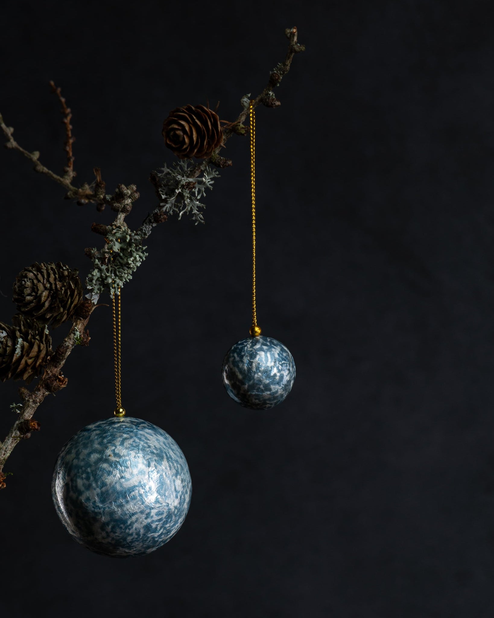 Flott julekule i fargen blå med mønster i sølv - Kulen er 6 cm