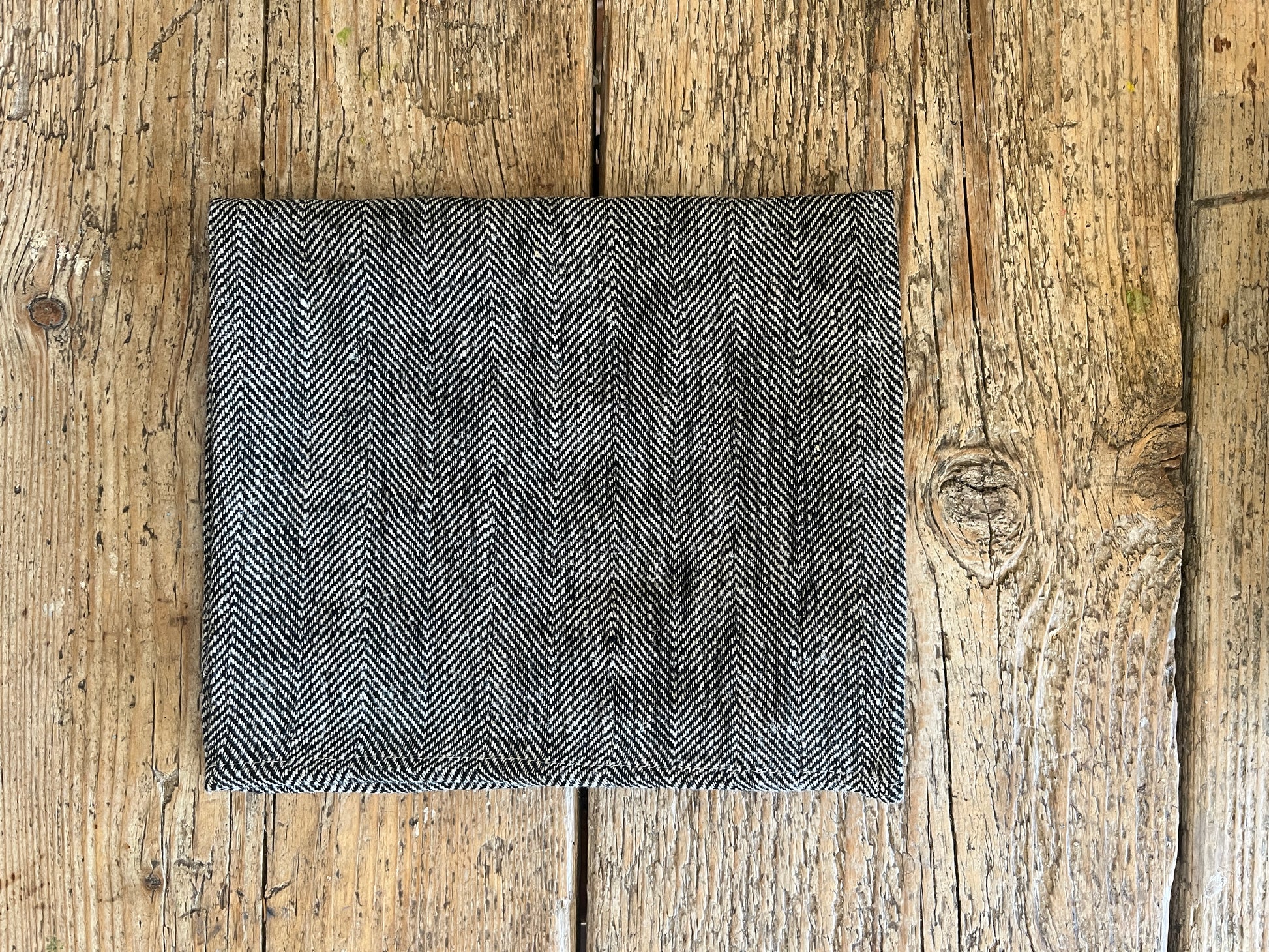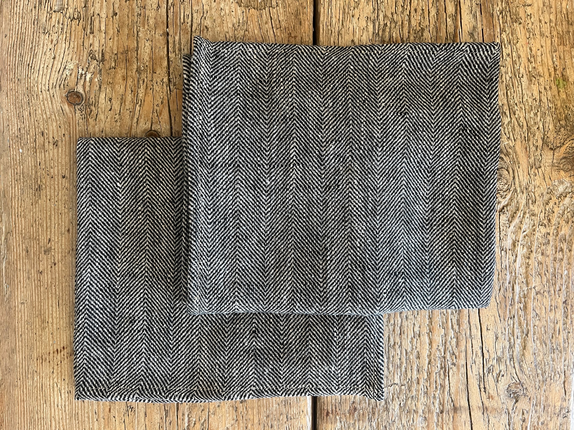 Håndkleet er klassisk fiskebensmønster i sort og natur, det har en hampe så du enkelt kan henge det opp.