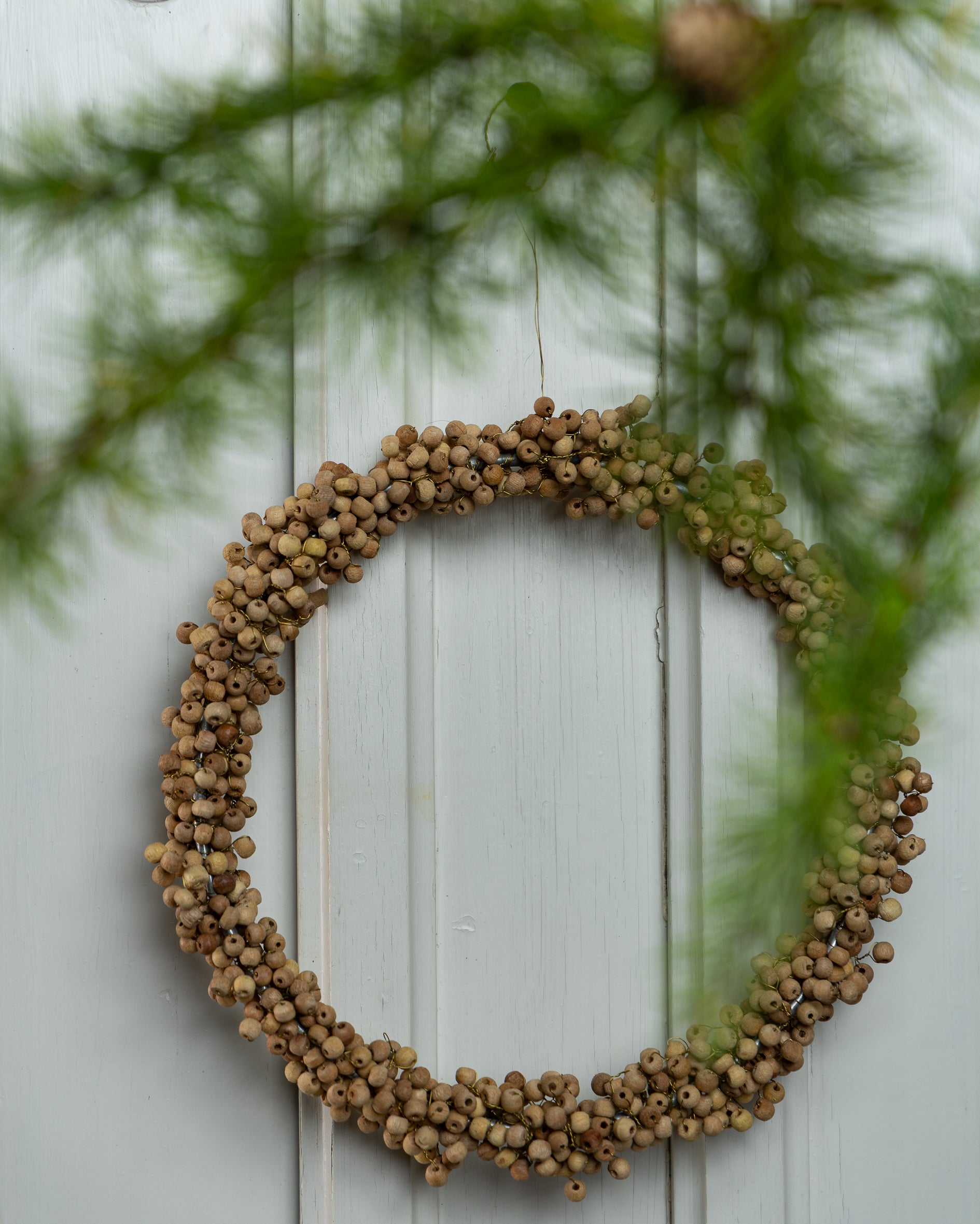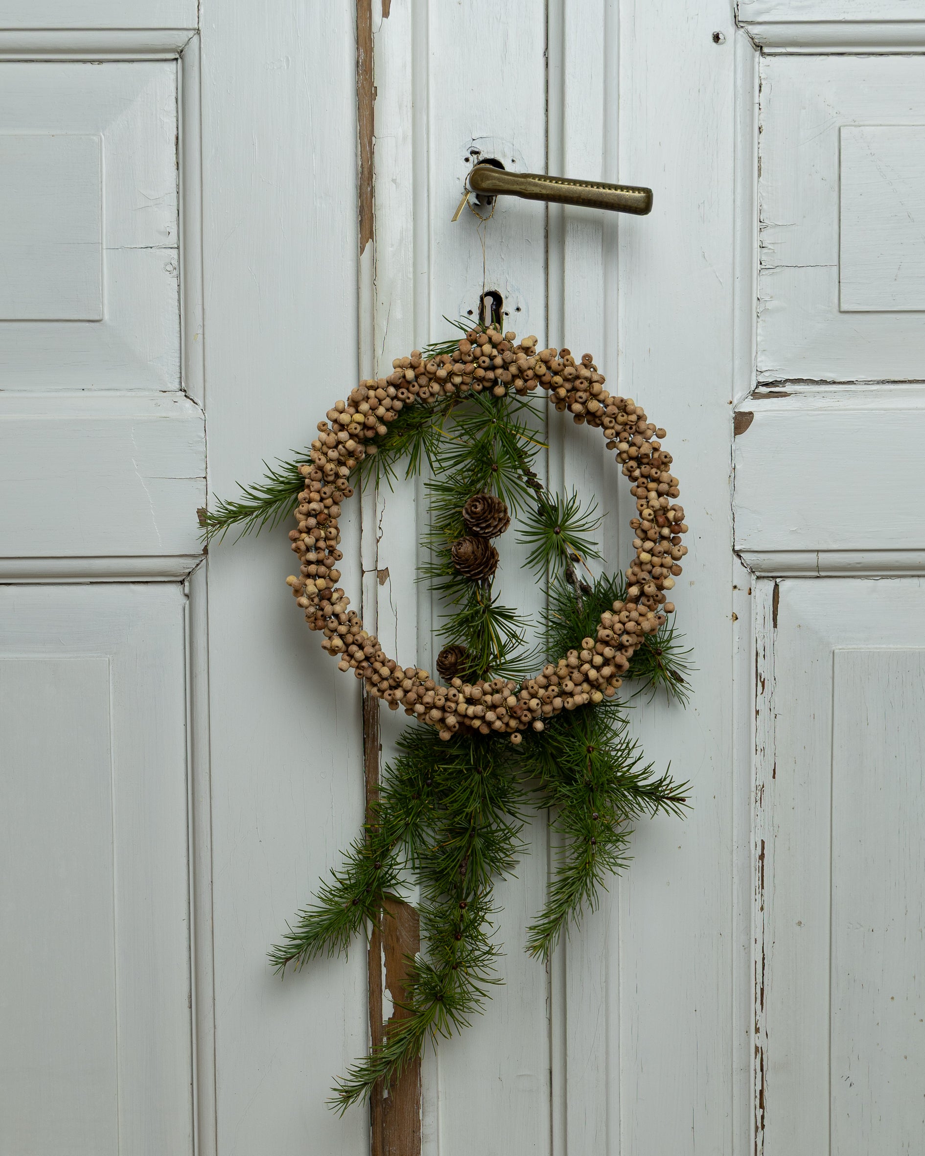 Vakker krans laget av treperler. Denne kransen er flott å henge på veggen, og kan også brukes som bordpynt som en dekorasjon. Kransen er håndlaget.