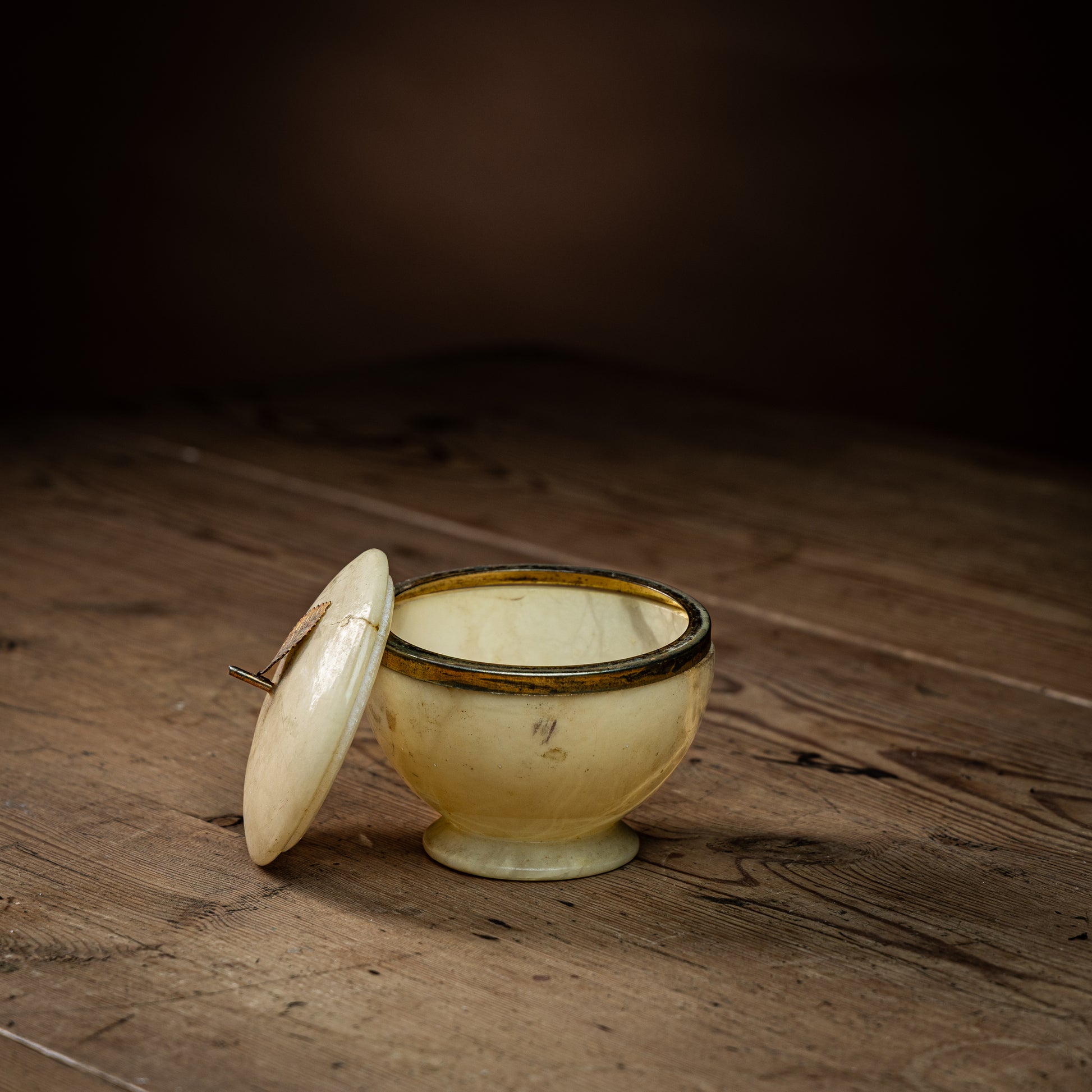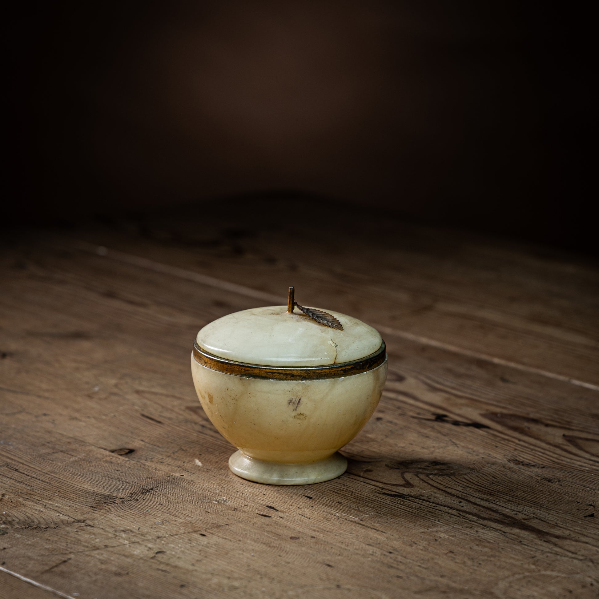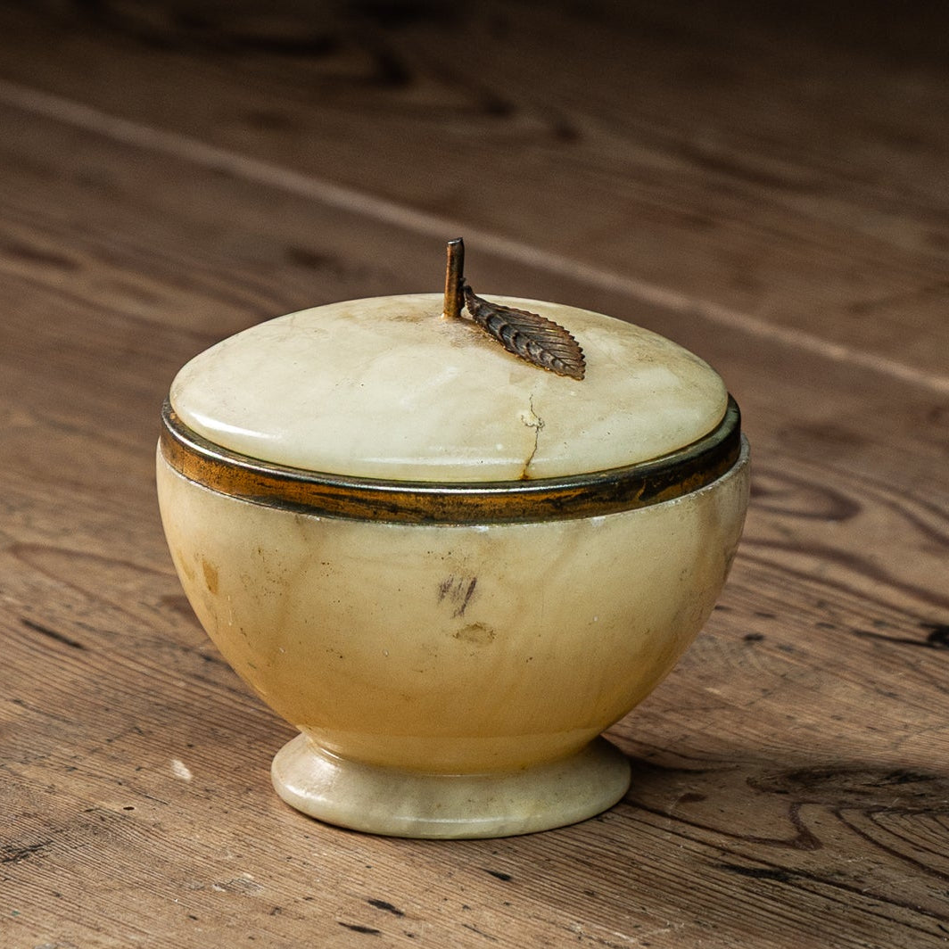 Sjarmerende krukke med lokk, laget av marmor. Krukken har en metallring, samt et lite blad som pynter på lokket. Perfekt til å gjemme bort smykker på baderommet, eller som et dekorativt pynteelement på stuebordet.