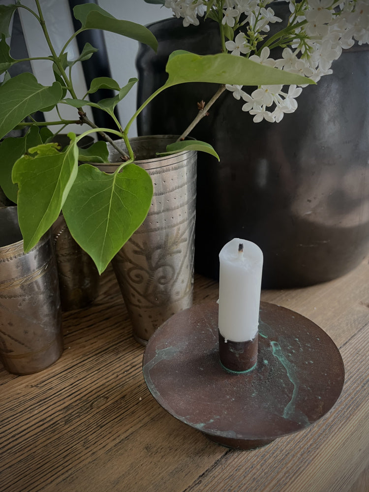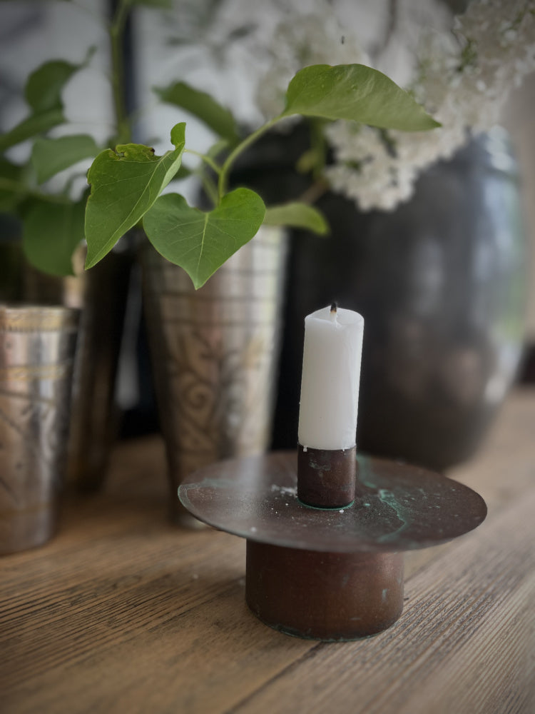 Flott kobberfarget lysestake i rustikk look. Lysestaken vil fortsette å patineres dersom den utsettes for fukt.