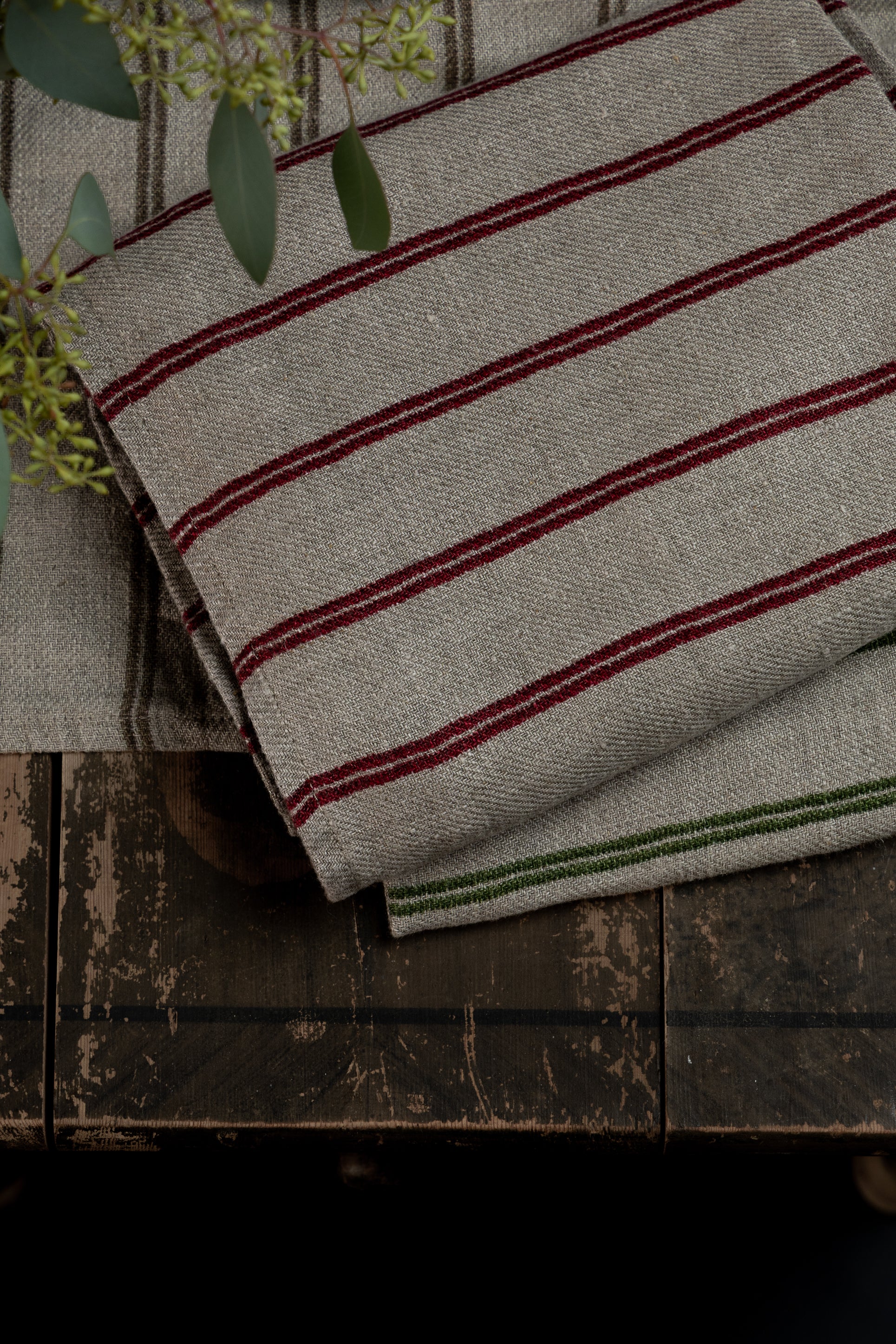 Axling lange løpere Vändteg naturrøde er laget av 100 % forvasket lin. Mønsteret i klassiske striper er trykt i 4 farger – offwhite naturfarget, offwhite brun, offwhite grønn og offwhite marineblå.