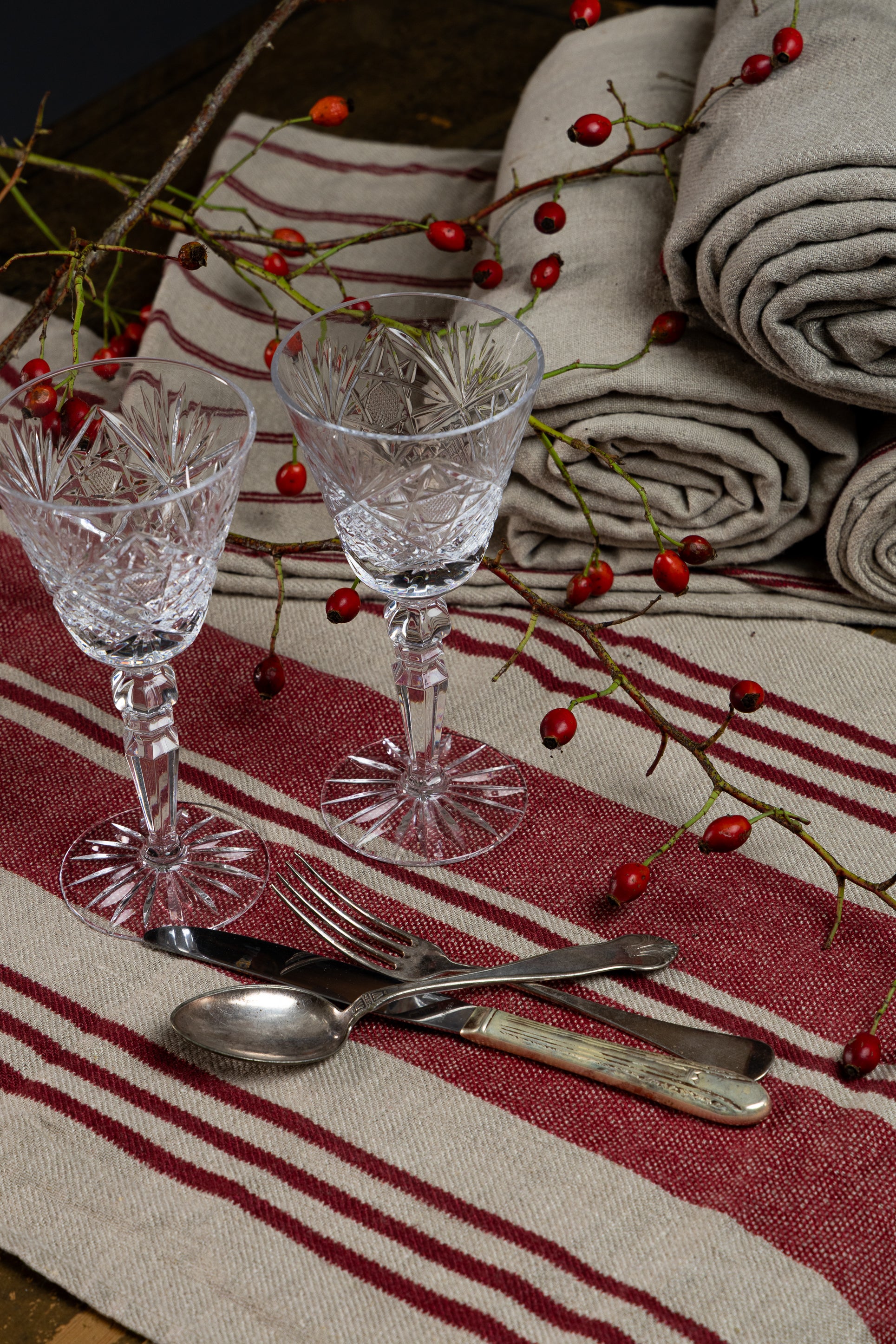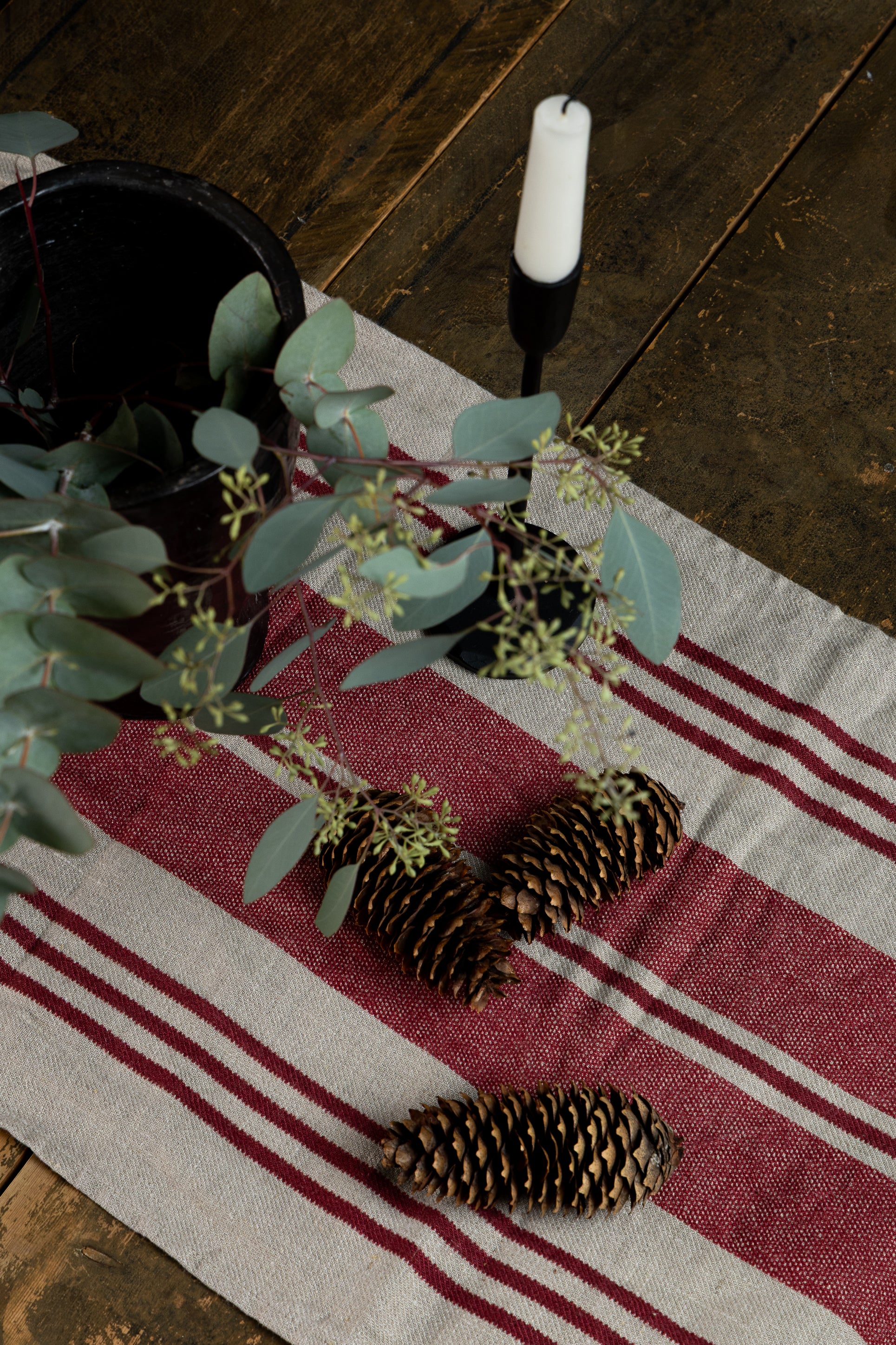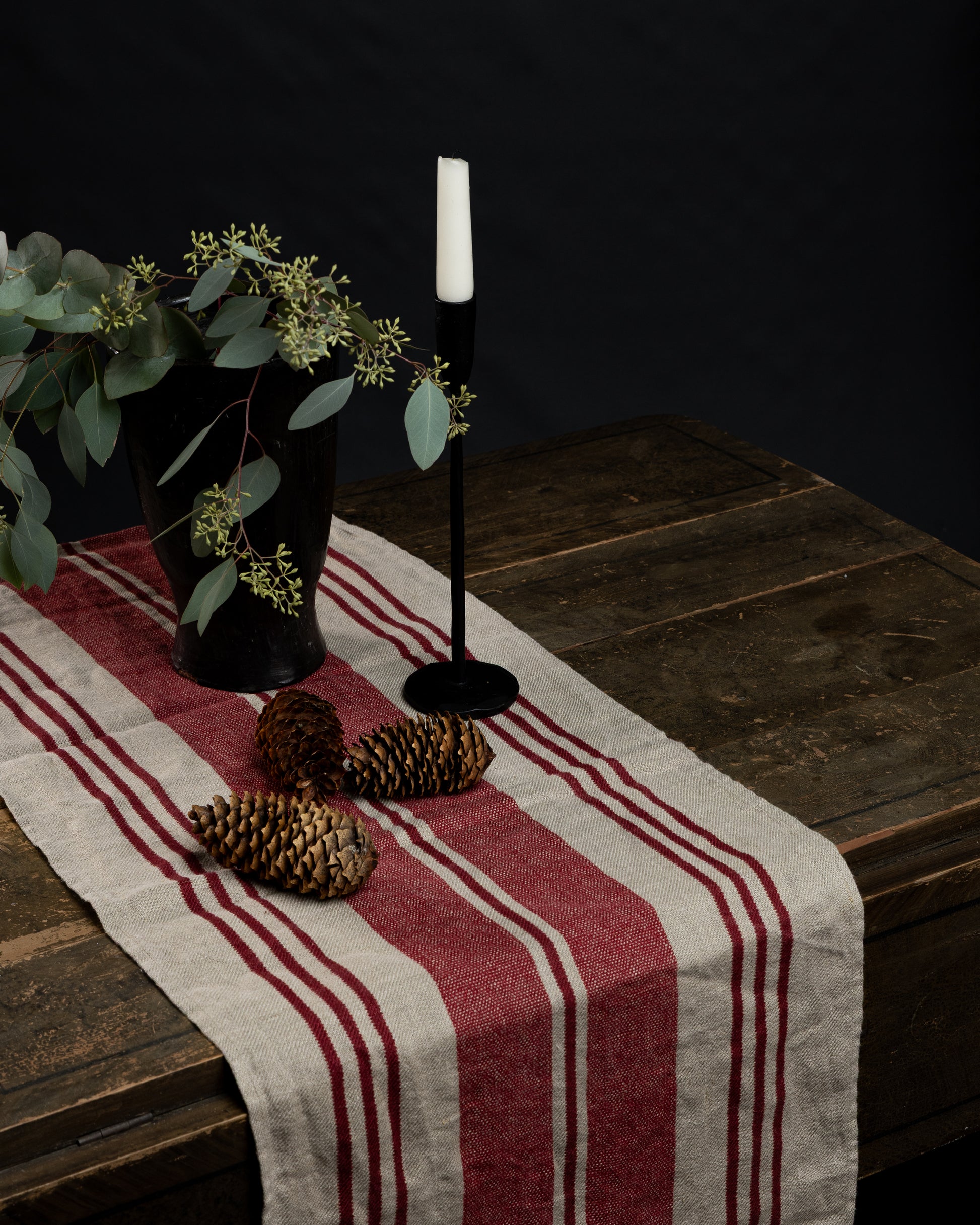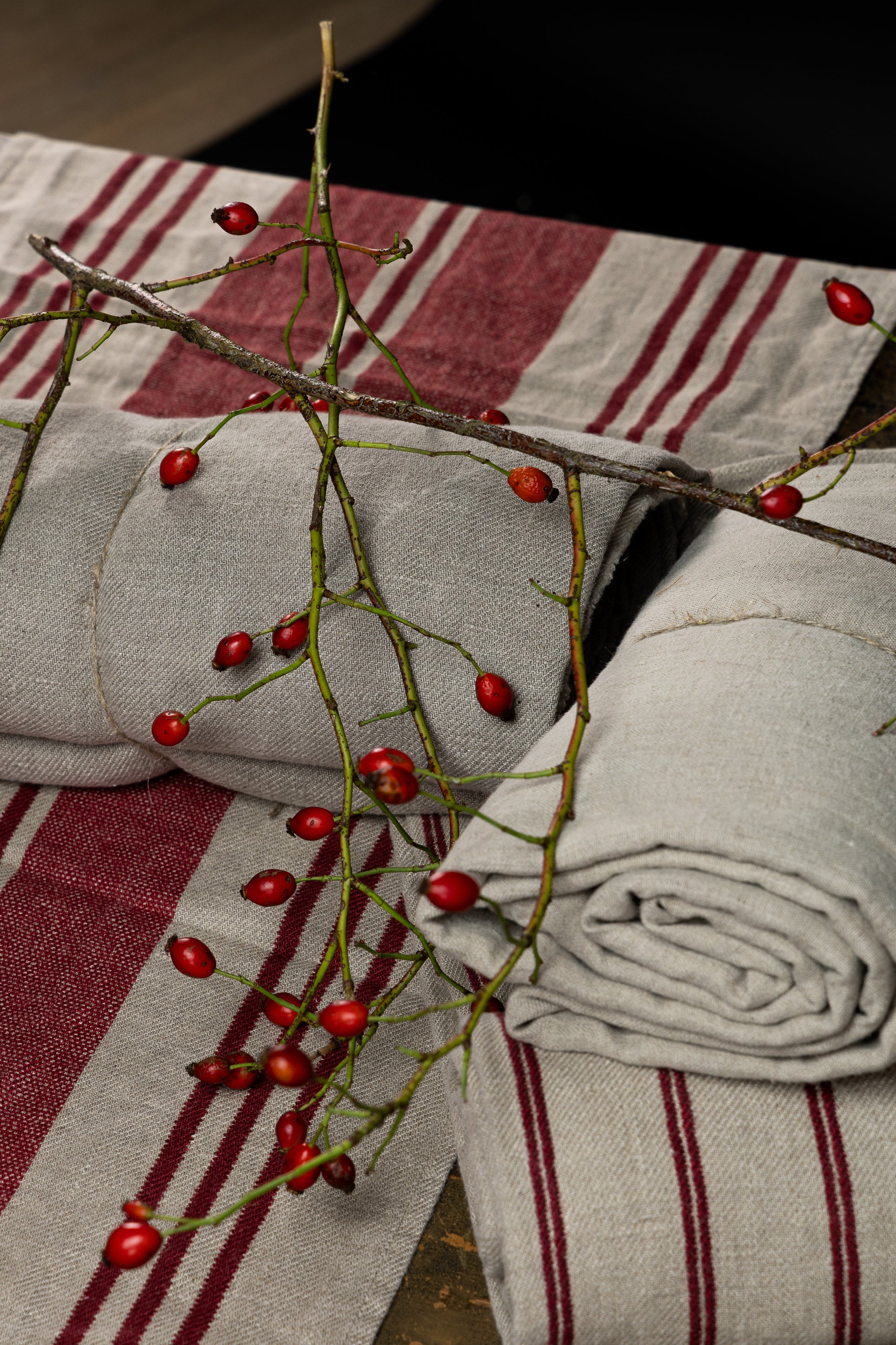 Axling lange løpere Vendteg naturrøde er laget av 100 % forvasket lin. Mønsteret i klassiske striper er trykt i 4 farger – offwhite naturfarget, offwhite brun, offwhite grønn og offwhite marineblå.