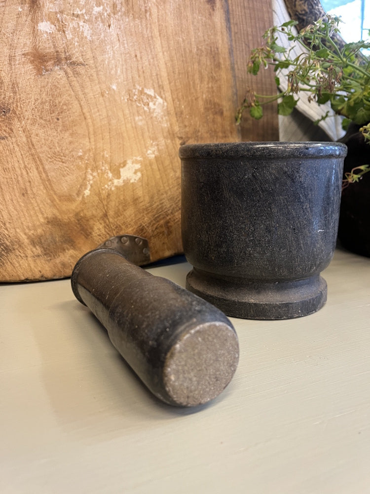 Morter i sten. Høyde 13 cm, diameter åpning 10 cm