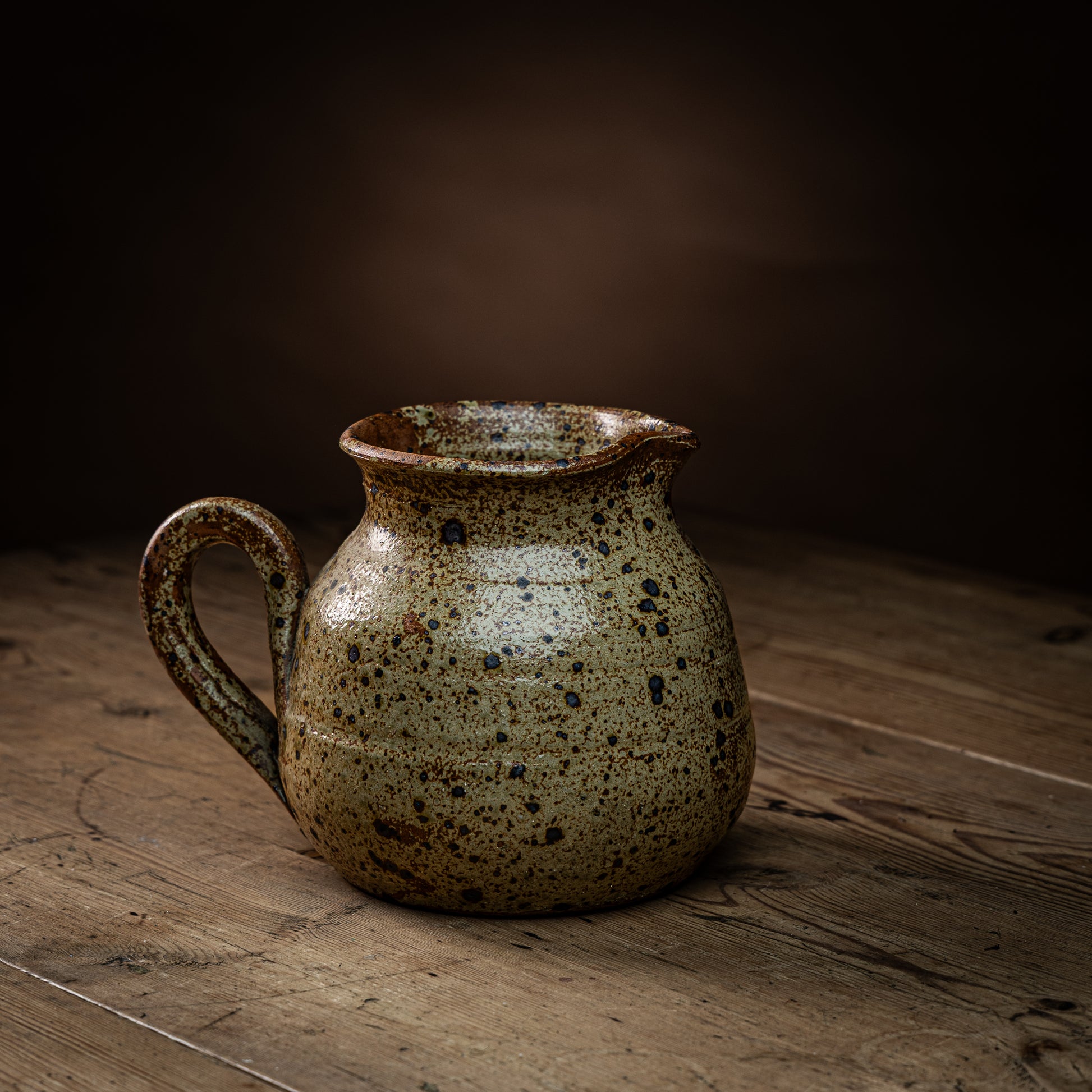 Kul mugge laget av grov leire, og med en fin grønnbrun glasur. Muggen er håndlaget og kjøpt på et marked i Spania. Parfekt som mugge, men også veldig kul som et dekorelement på kjøkkenet.