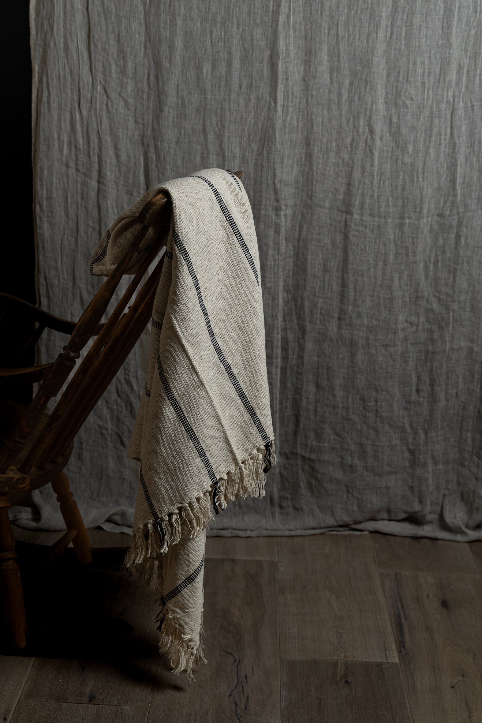 Deilig og stort bomullsteppe i fargene natur og sort.