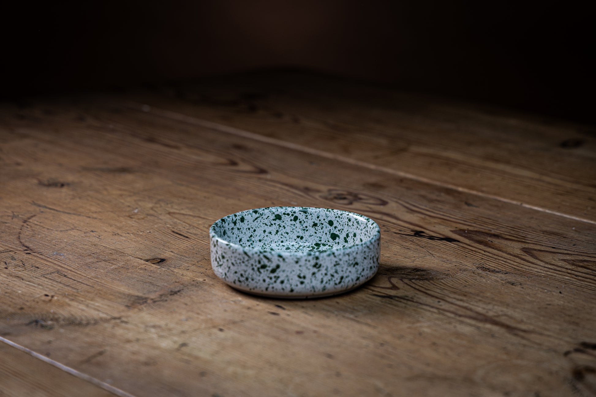 Prikkete liten skål i hvitt og grønt. Pen som lysfat for kubbelys, eller kanskje for å samle smykkene på badet?
