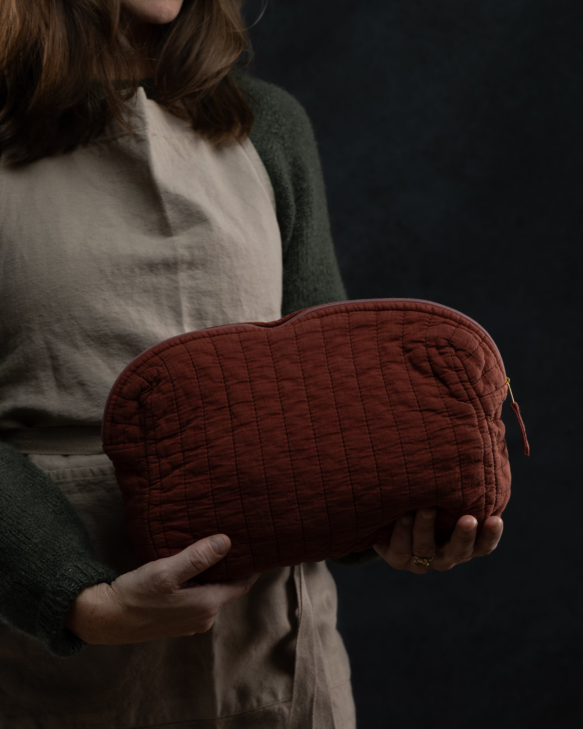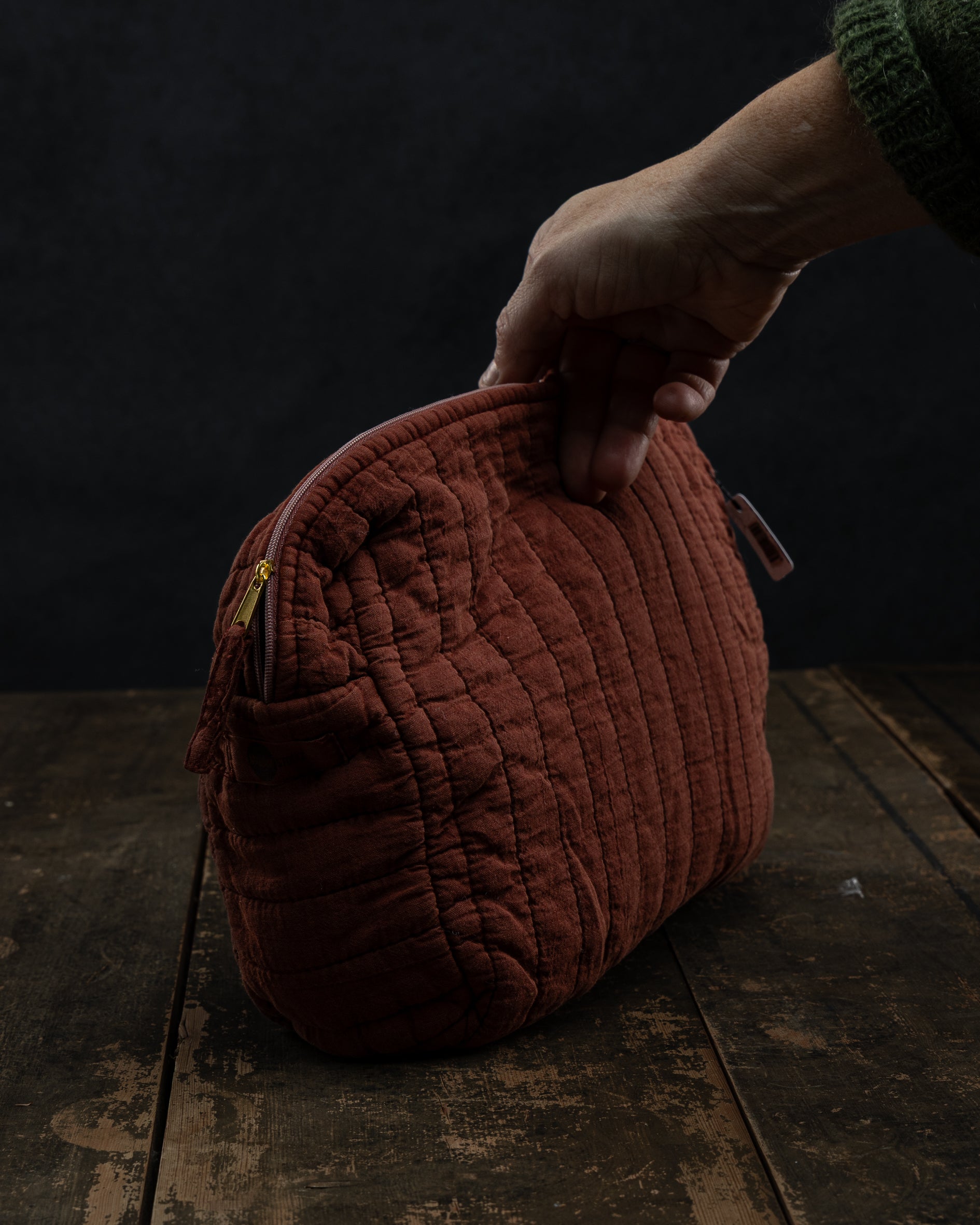 Laget av slitesterk bomull med polstring av polyester, er denne vesken både praktisk og sjarmerende. Den rike mahognifargen kompletterer den myke, steinvaskede finishen, noe som gjør den til et allsidig valg for ulike oppbevaringsbehov.