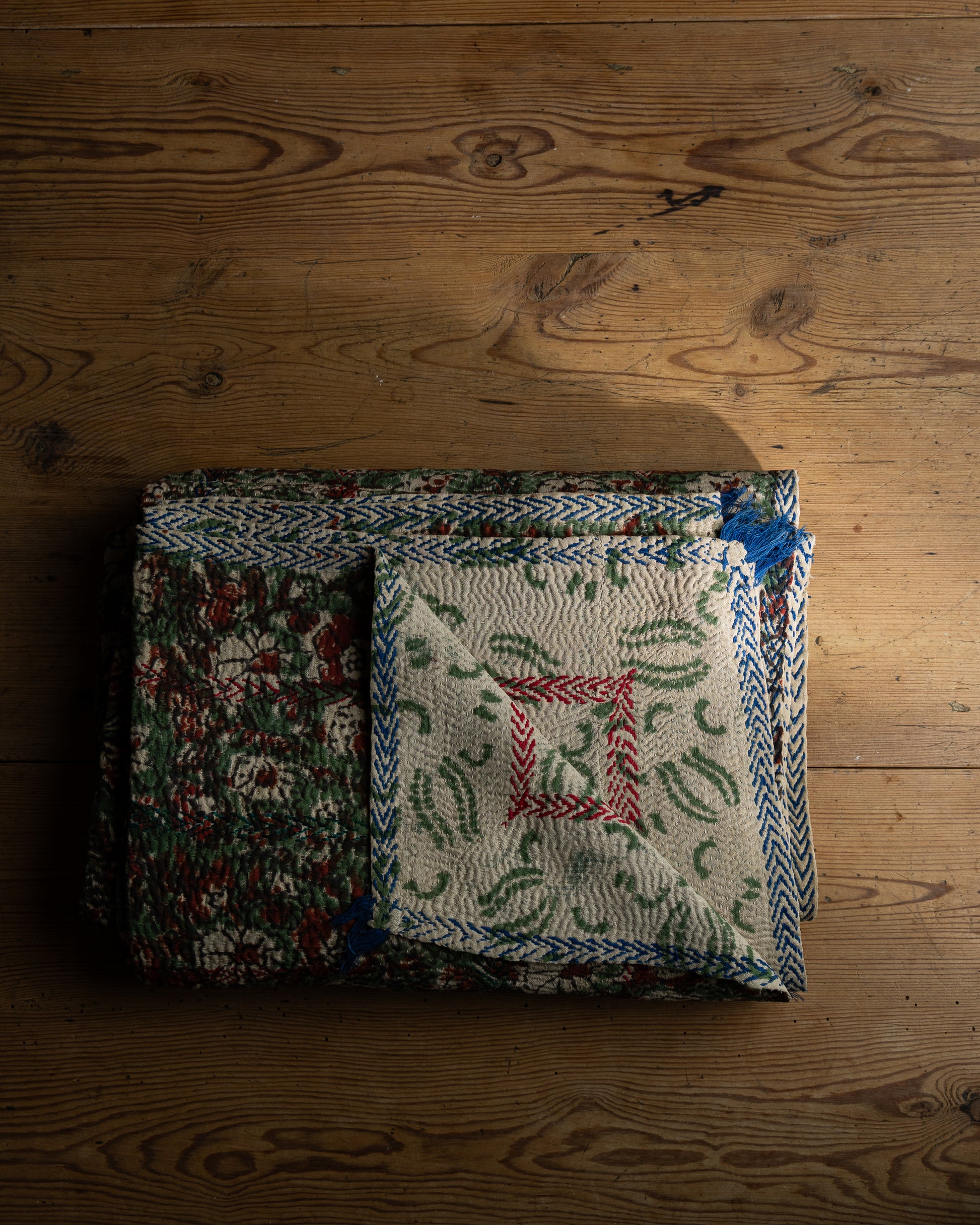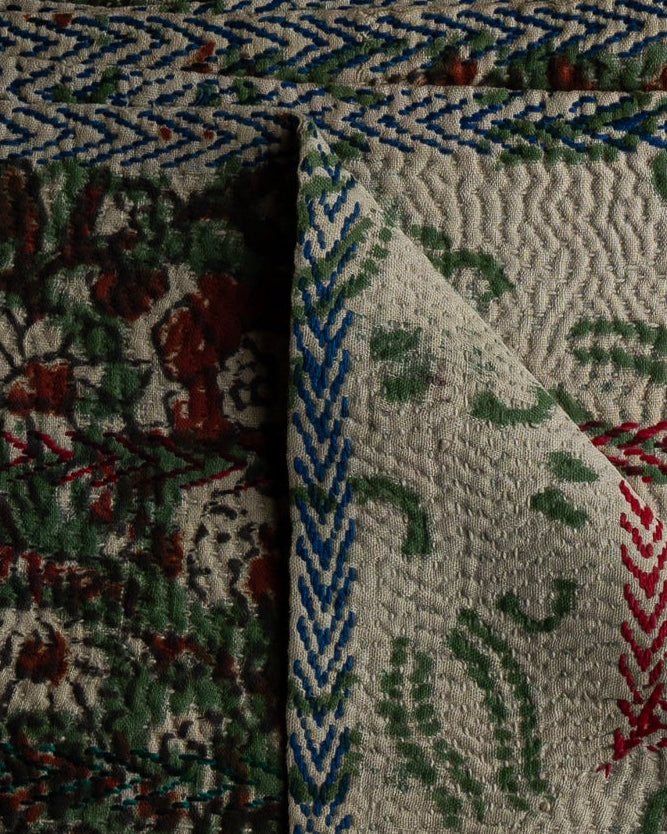 Teppet er sydd av indiske sarier, den tradisjonsrike indiske klesdrakten. Hvert teppe er unikt, og alle har sjarmerende små detaljer. Teppet kan brukes som sengeteppe, eller i sofakroken.