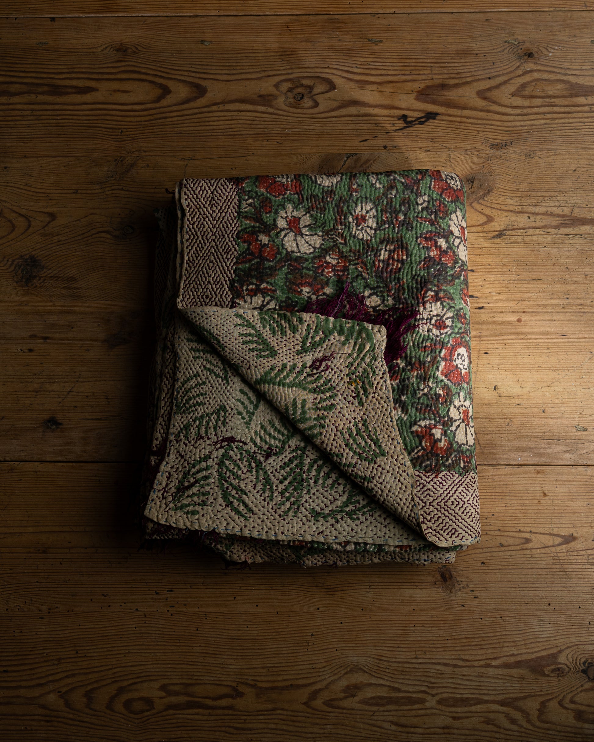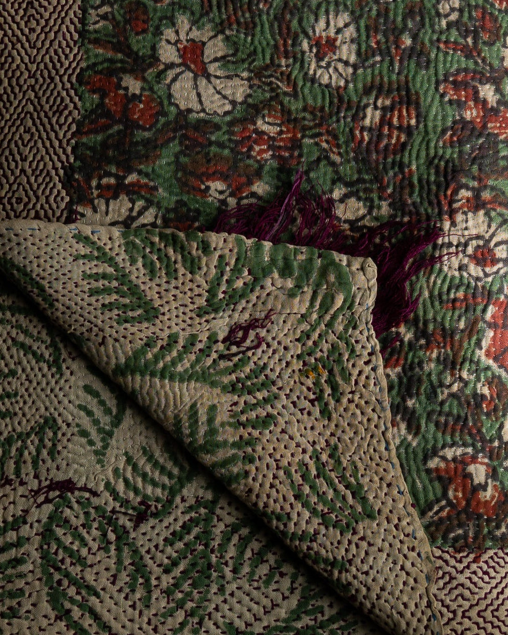 Teppet er sydd av indiske sarier, den tradisjonsrike indiske klesdrakten. Hvert teppe er unikt, og alle har sjarmerende små detaljer. Teppet kan brukes som sengeteppe, eller i sofakroken.