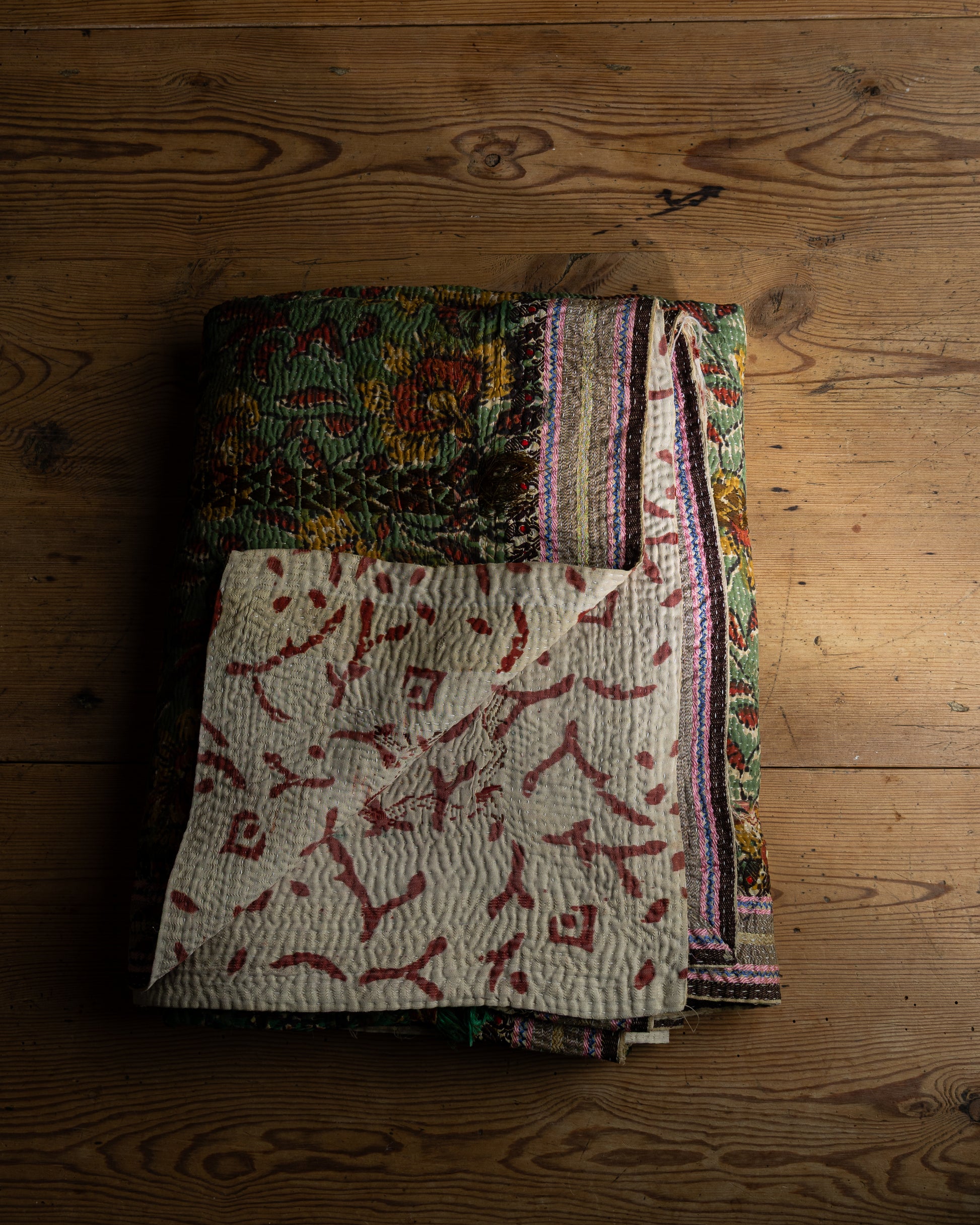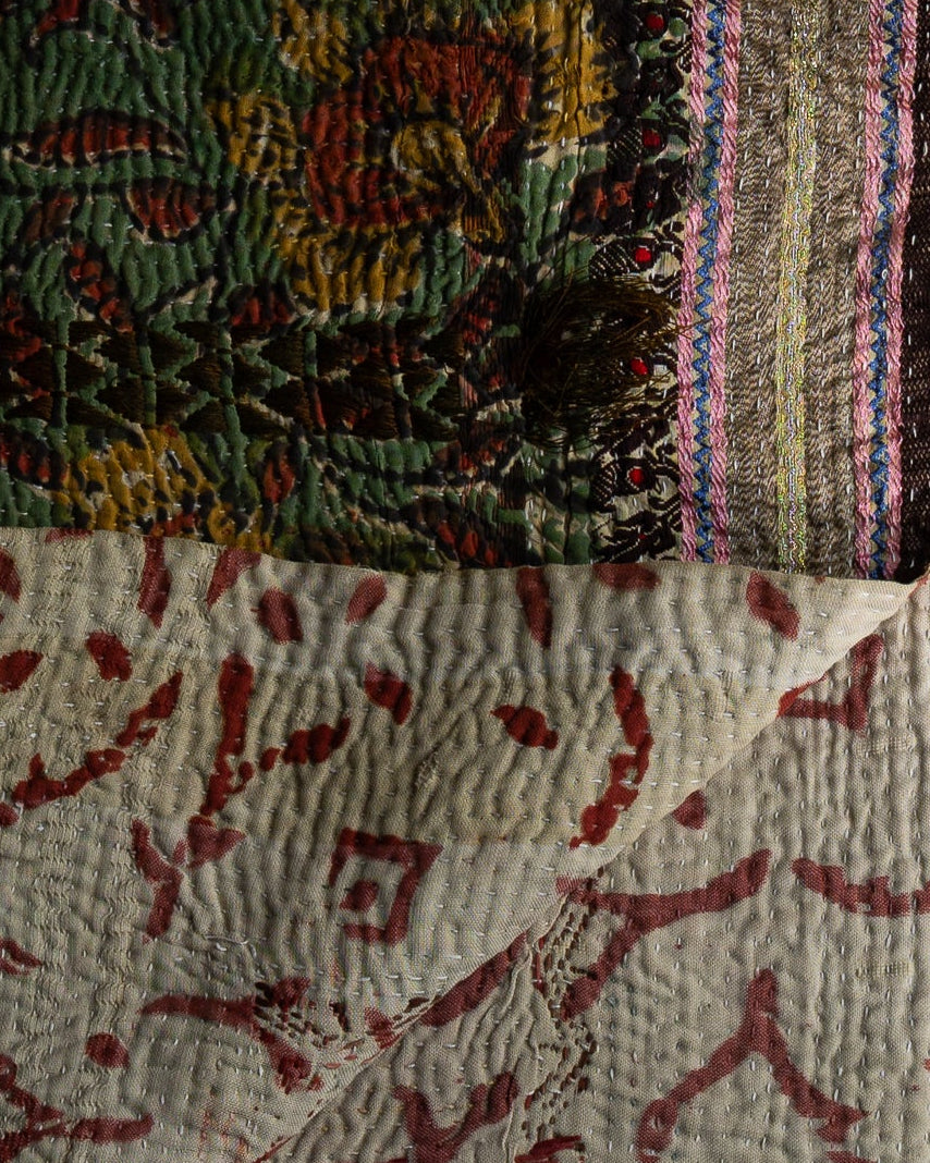 Teppet er sydd av indiske sarier, den tradisjonsrike indiske klesdrakten. Hvert teppe er unikt, og alle har sjarmerende små detaljer. Teppet kan brukes som sengeteppe, eller i sofakroken.