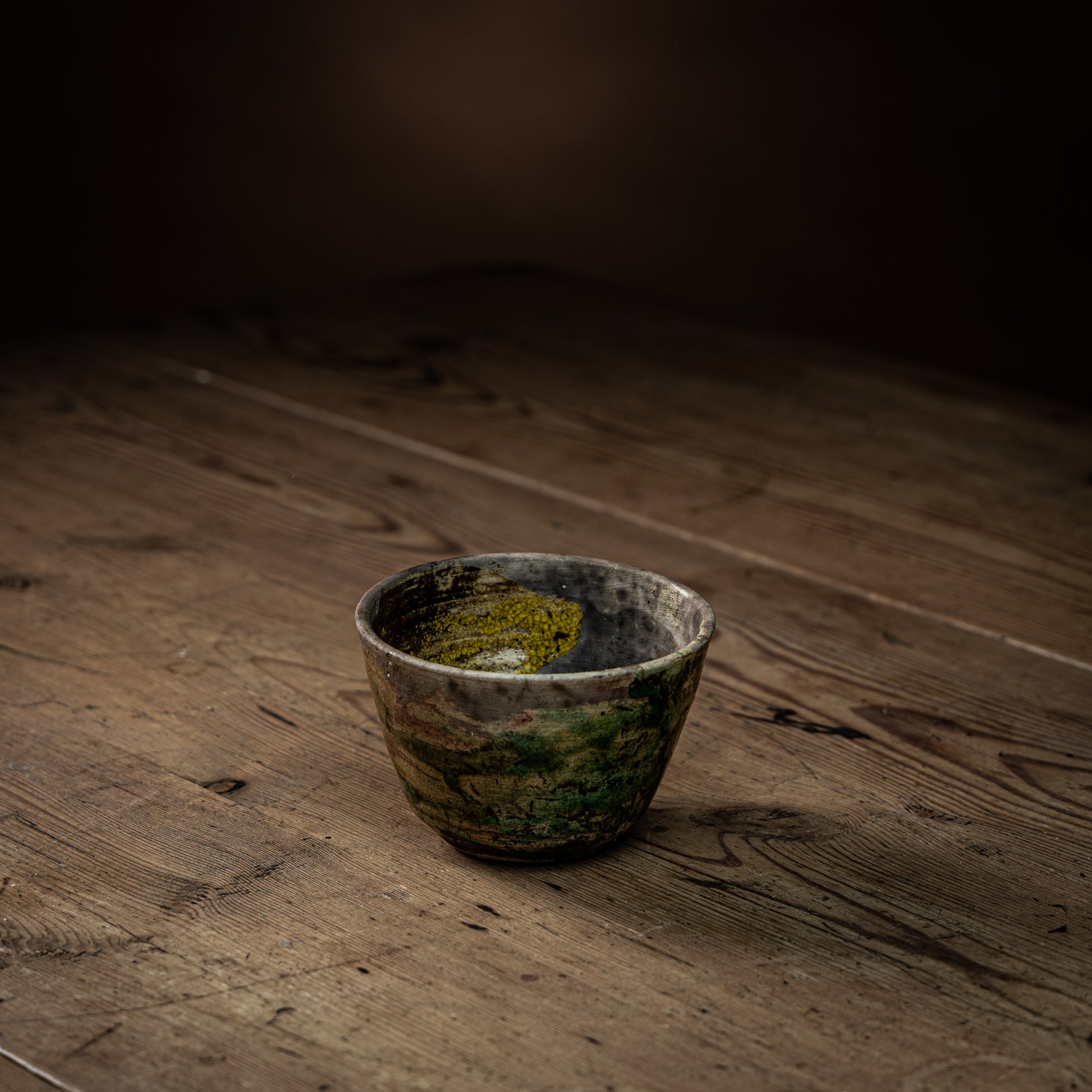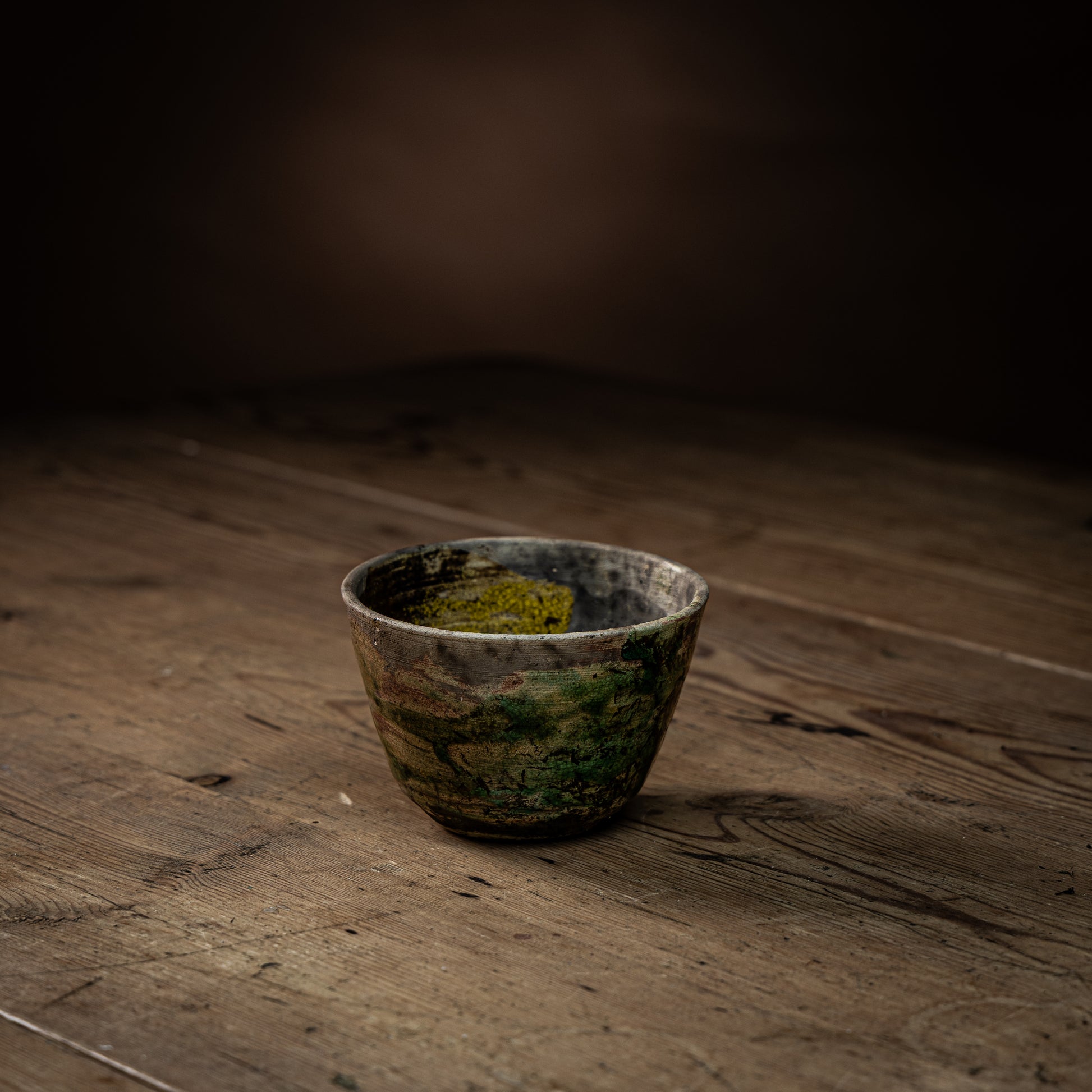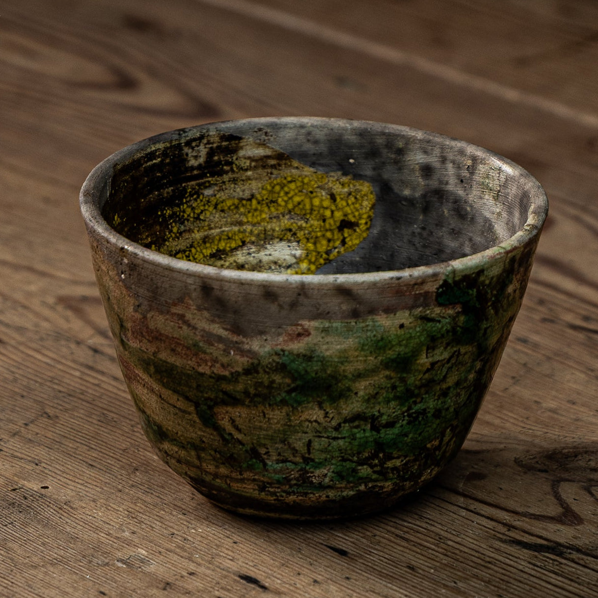 Unik liten skål av keramikk, deilige grønn, gul og bruntoner i glasuren.