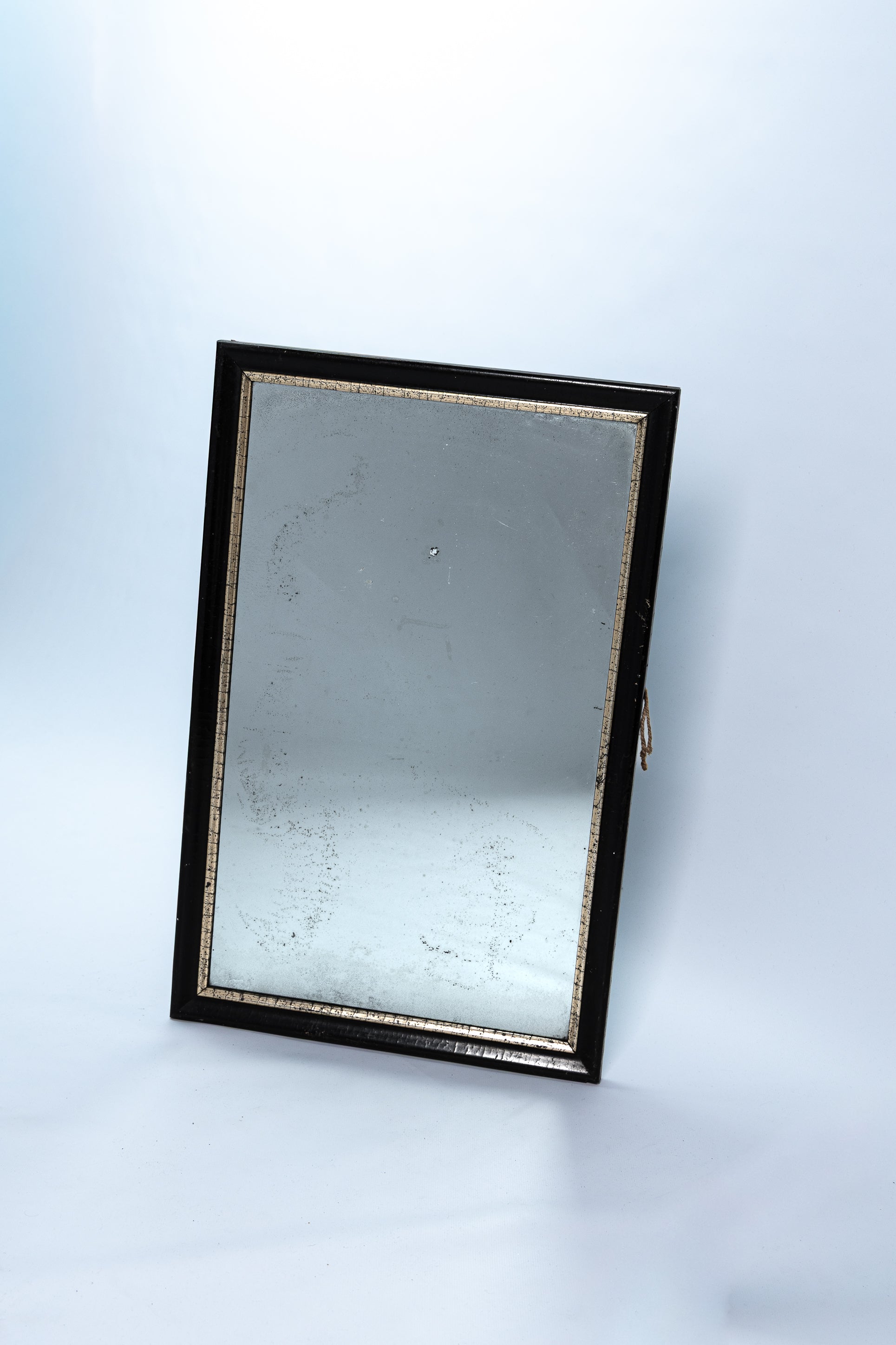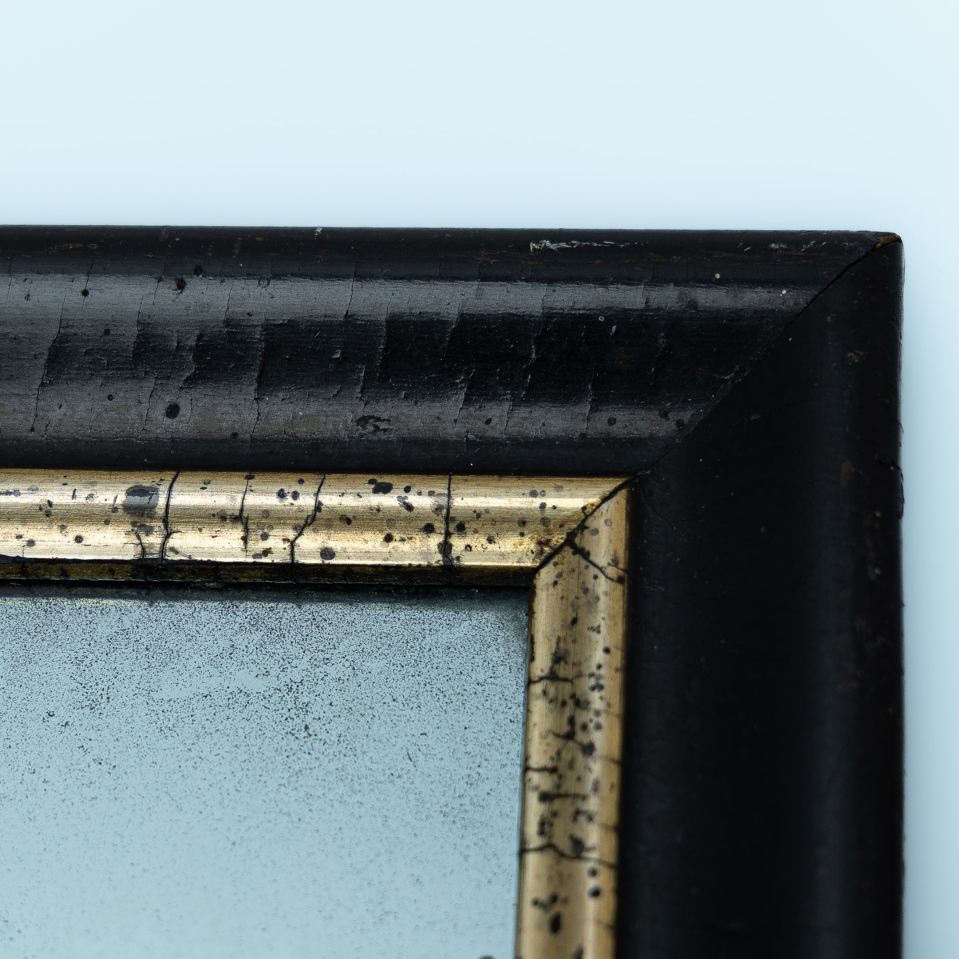 Flott gammelt speil med treramme, speilet er noe krakelert. Opphang bak.