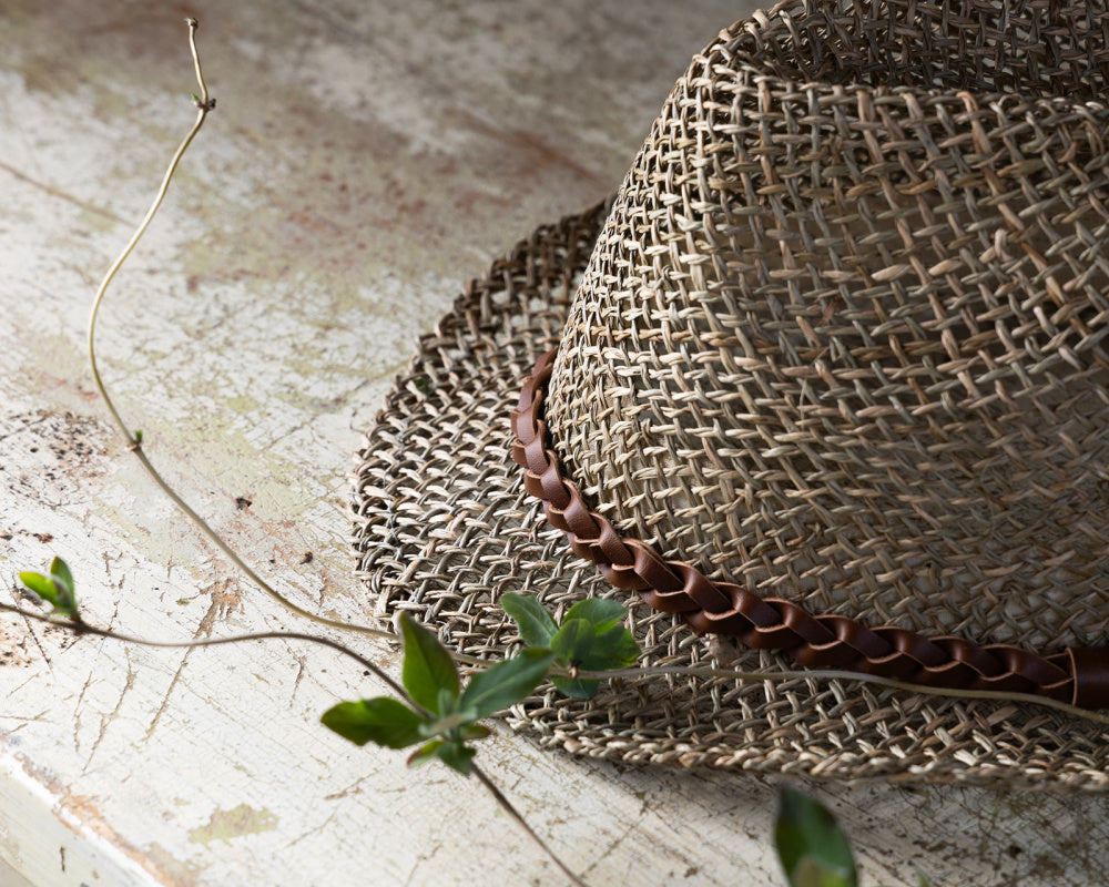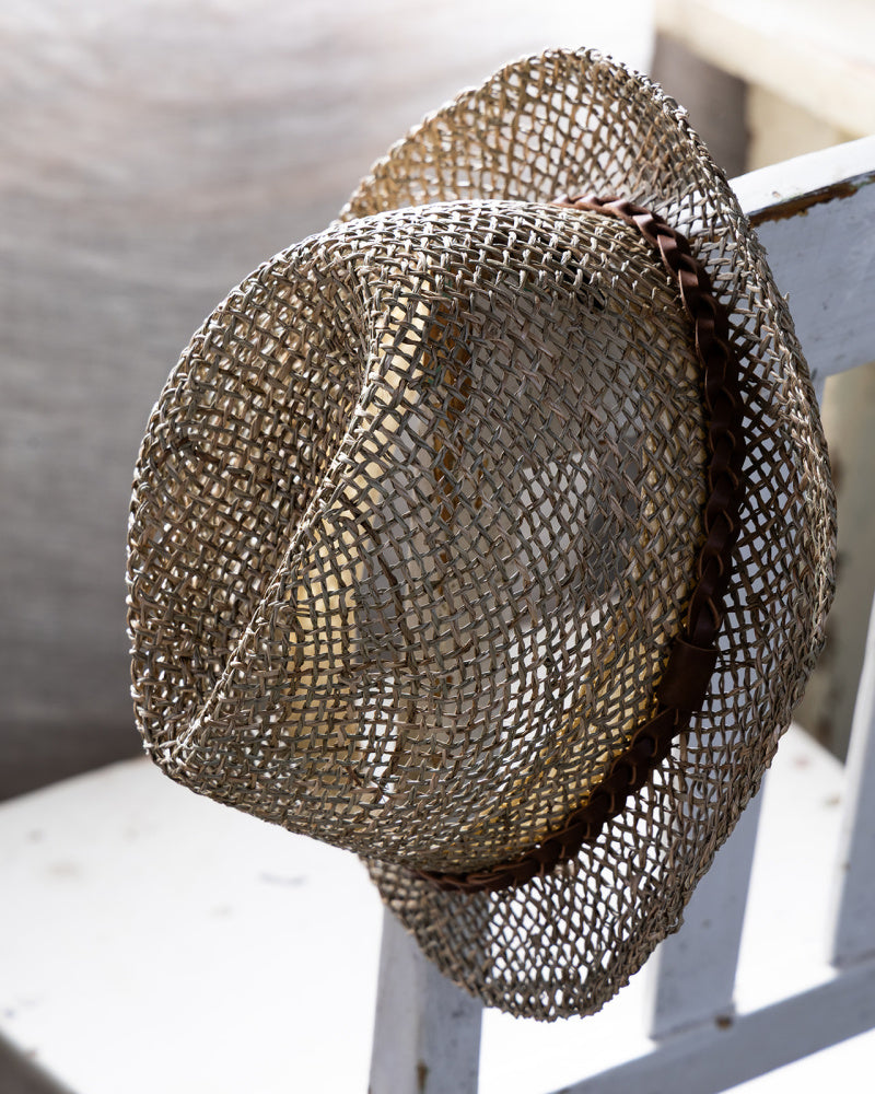 Fin stråhatt laget av sjøgress og skinnreim. Passer fint på en deilig sommerdag.