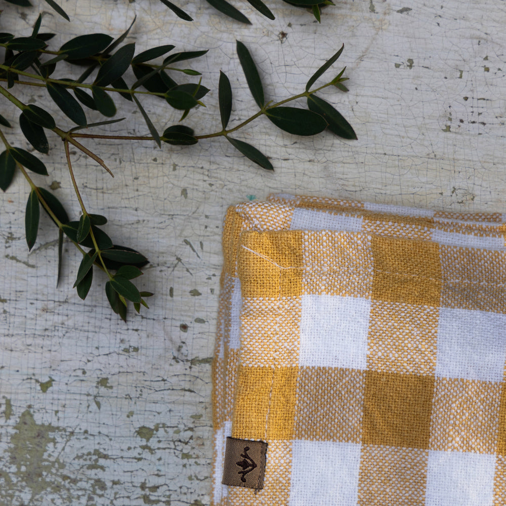 Tøyserviett med gule og hvite ruter. Lekre servietter er perfekte for å skape god stemning rundt bordet, husk også å bruke de til hverdags. Rutene gir serviettene en rustikk og tøff look.