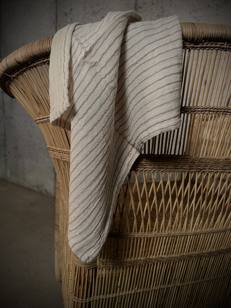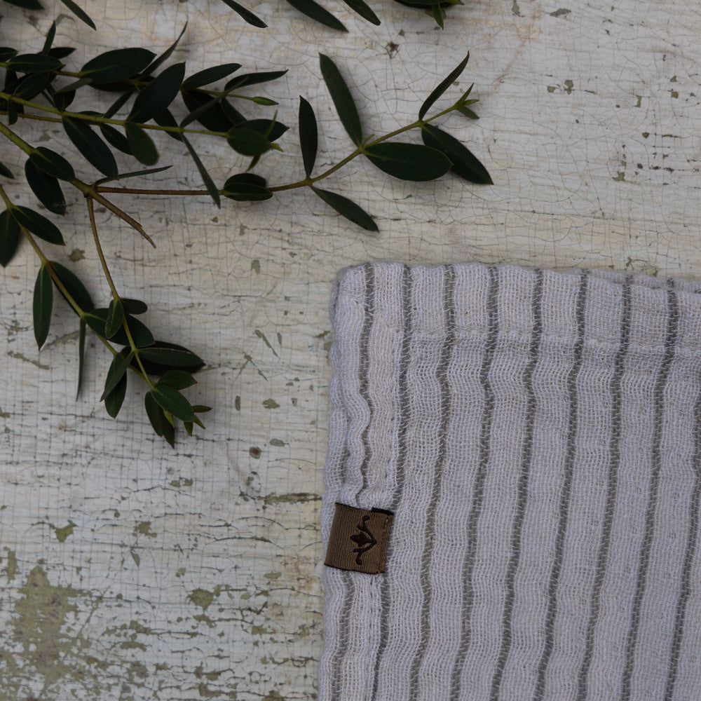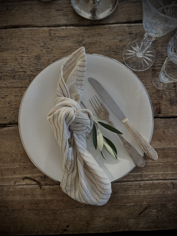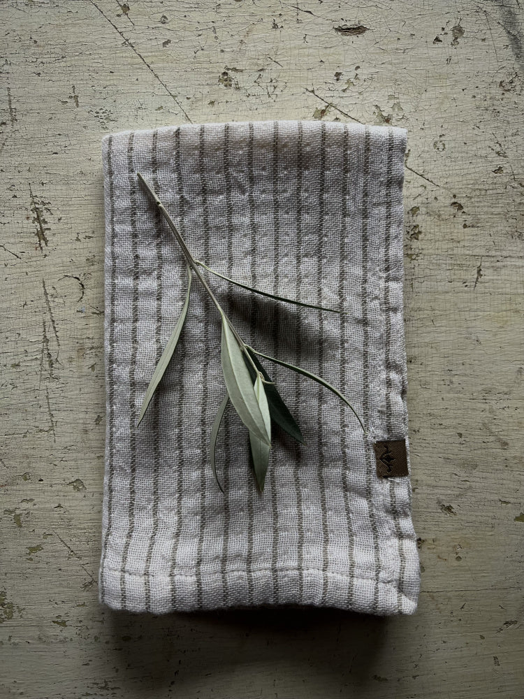 Flott serviett i bomull, klassiske striper i elfenbenshvit og olivengrønn. Servietten tåler selvfølgelig maskinvask, og trenger ikke å strykes før bruk, da den litrt krøllete looken gir en avslappet atmosfære til bordet.