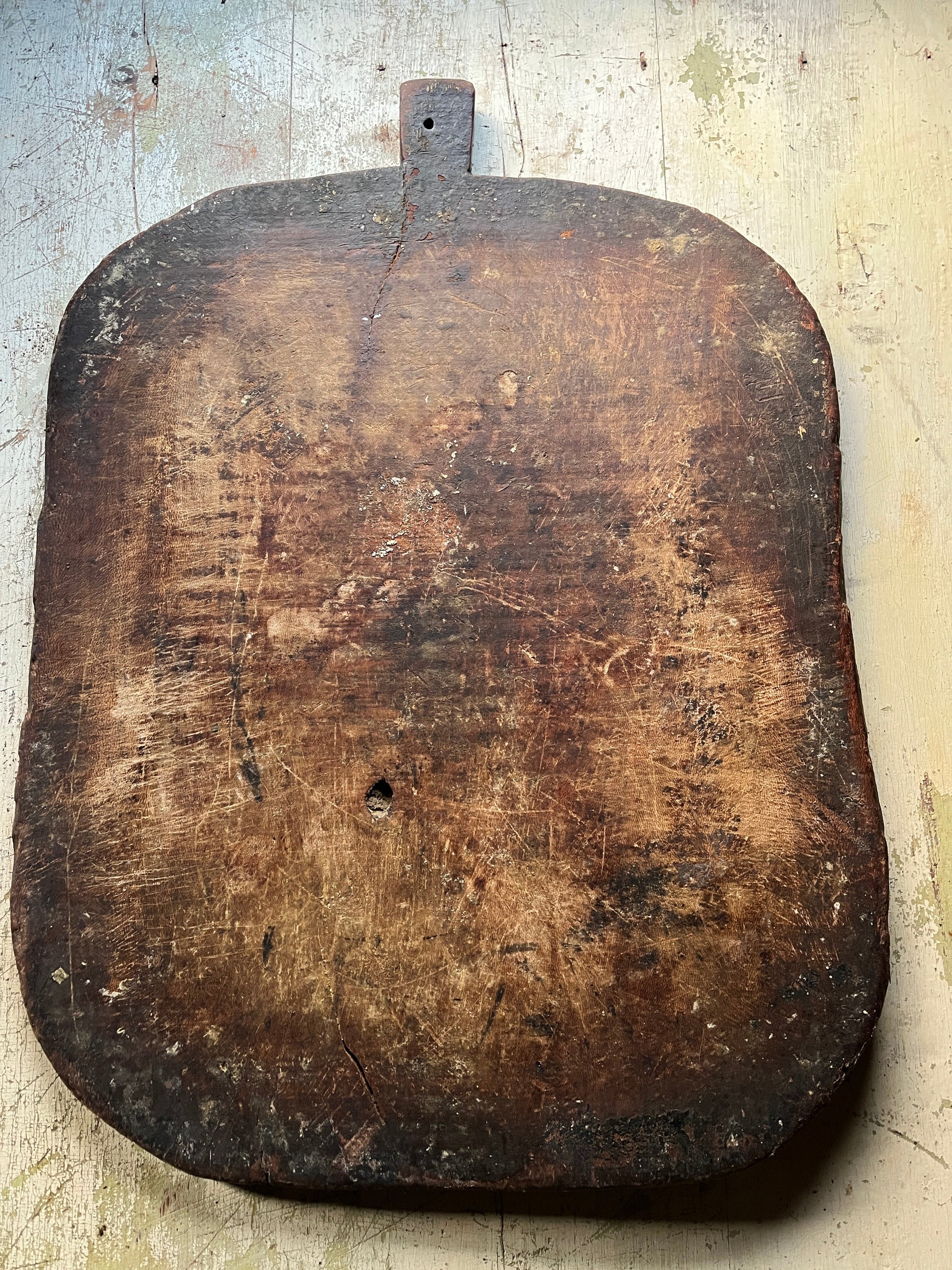 Vakker stor vintage trefjøl med en herlig patina. Skjærefjøla er full av levd liv og er et smykke i seg selv. Kan også brukes som serveringsfat til pizza, oster eller tapas, eller som skjærefjøl.
