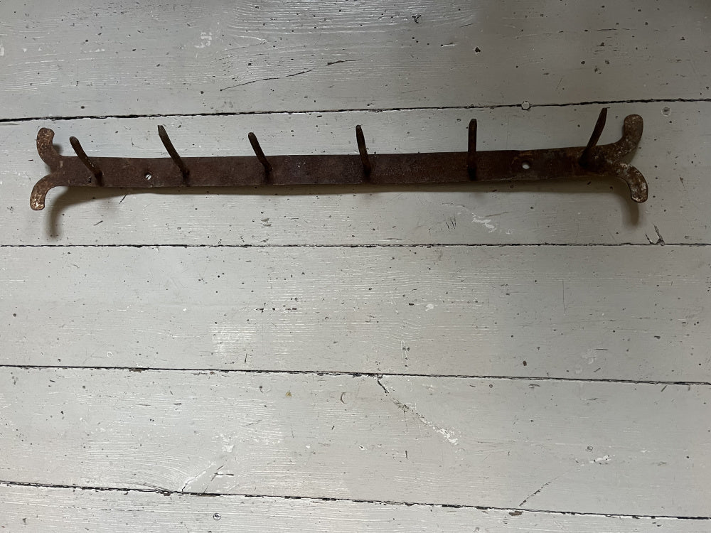 Gammel knaggrekke med flott detalj i endene. 6 stk kraftige knagger. 2 store hull til feste.