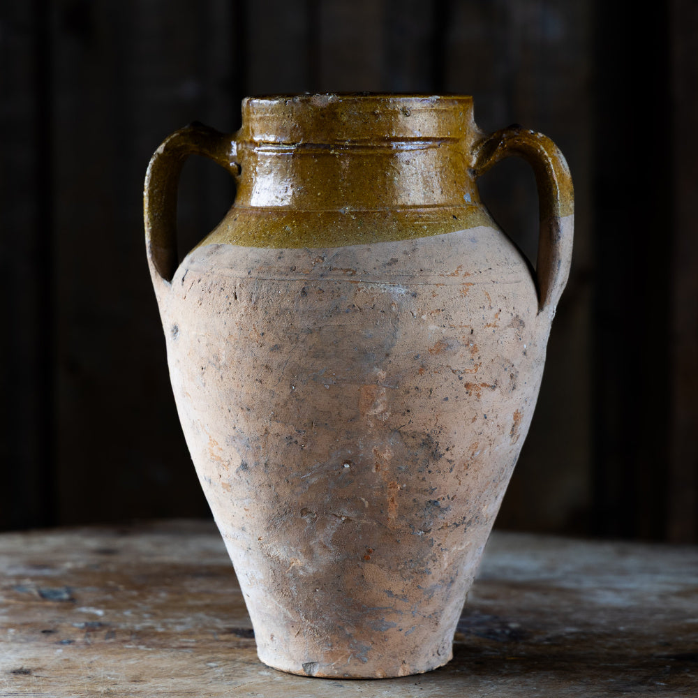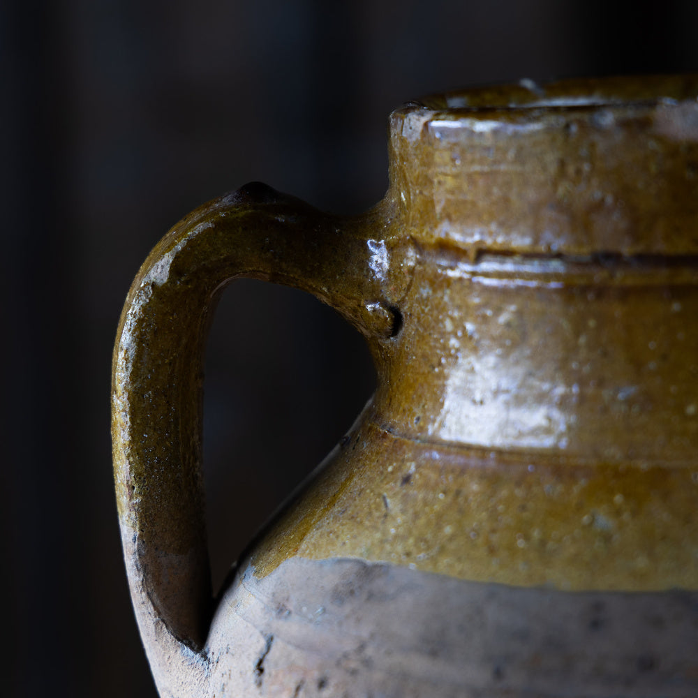 Unik eldre krukke av leire, krukken har to hanker og en gulbrum glasur langs toppen av krukken. Perfekt som dekor på hylla, eller som blomstervase på kjøkkenbenken. Anbefales at man setter ett glass el lign inni krukka dersom den skal benyttes til friske blomster.