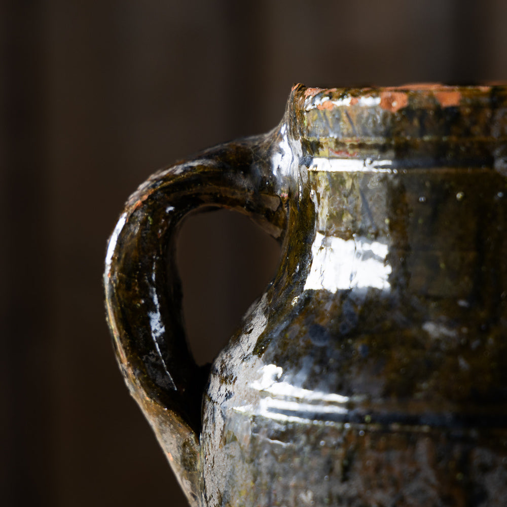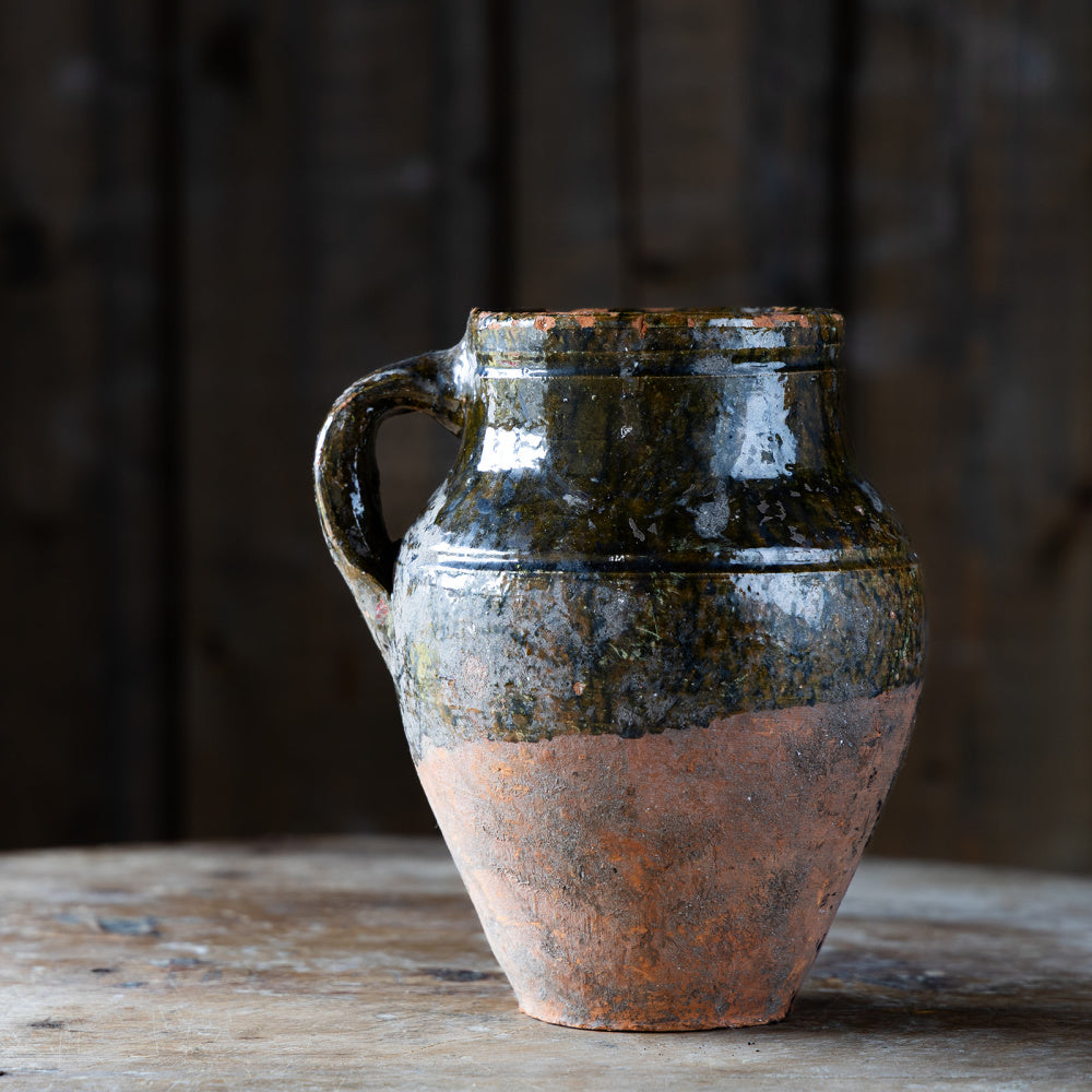 Eldre krukke med en hank. Krukken er glasert i en dyp brun glasur på øvre del av krukka. Perfekt som vase for dine favorittblomster, sett da en vase inni krukka, da den ikke er 100% vanntett.