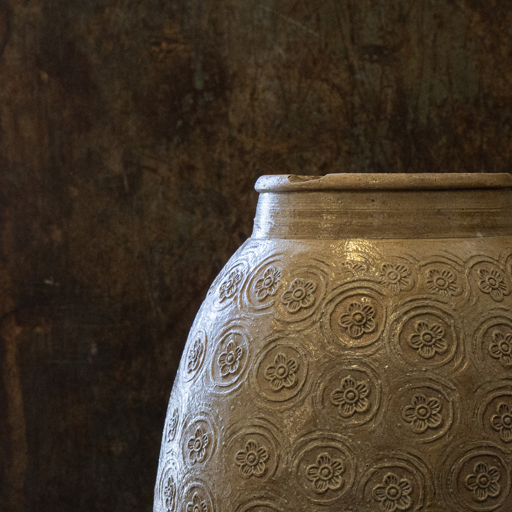 Lekker glasert  vintagekrukker som opprinnelig har vært brukt til oppbevaring av mat.  Krukken er i varme sandtoner, og med blomstermønster.